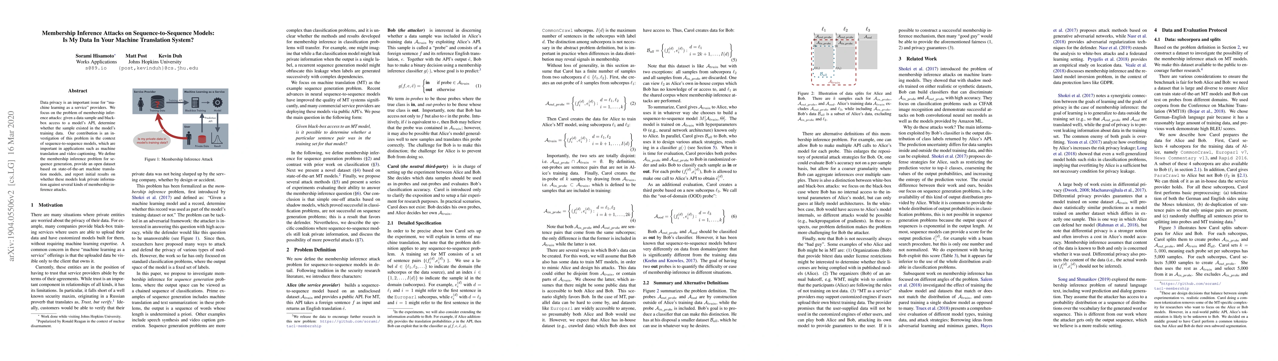 This paper investigates membership inference attacks on sequence-to-sequence models, focusing on whether a given sample was part of the training data. It introduces a new dataset based on machine translation models and reports findings on the vulnerability of these models to such attacks.