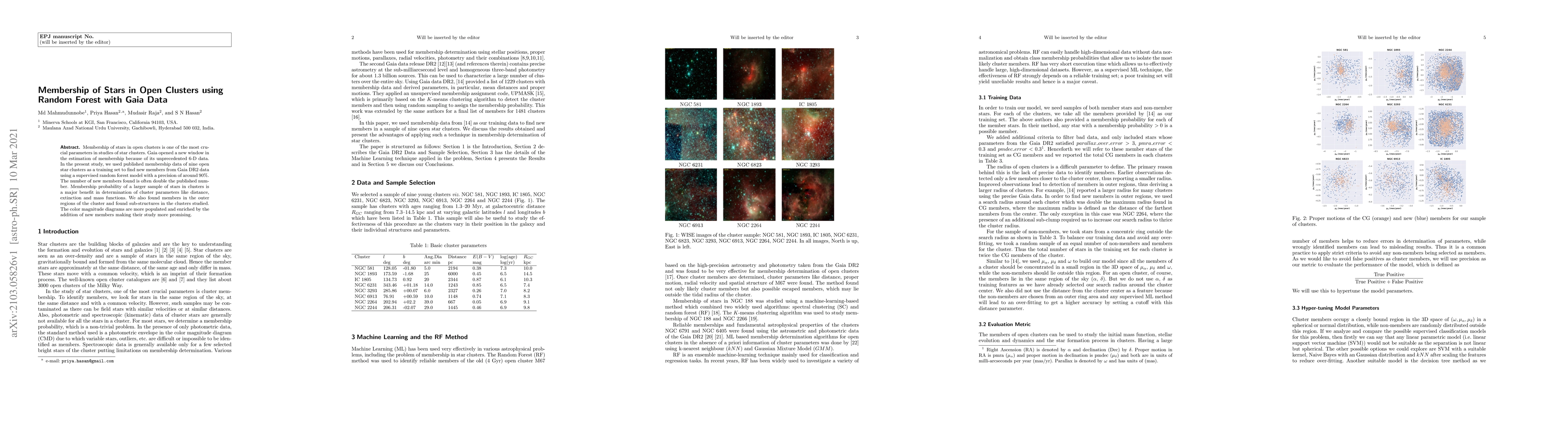 This study employs a supervised random forest model using Gaia DR2 data to identify new members in nine open star clusters, achieving a membership precision of around 90%. The method often doubles the number of previously known members, enhancing the determination of cluster parameters and revealing sub-structures.