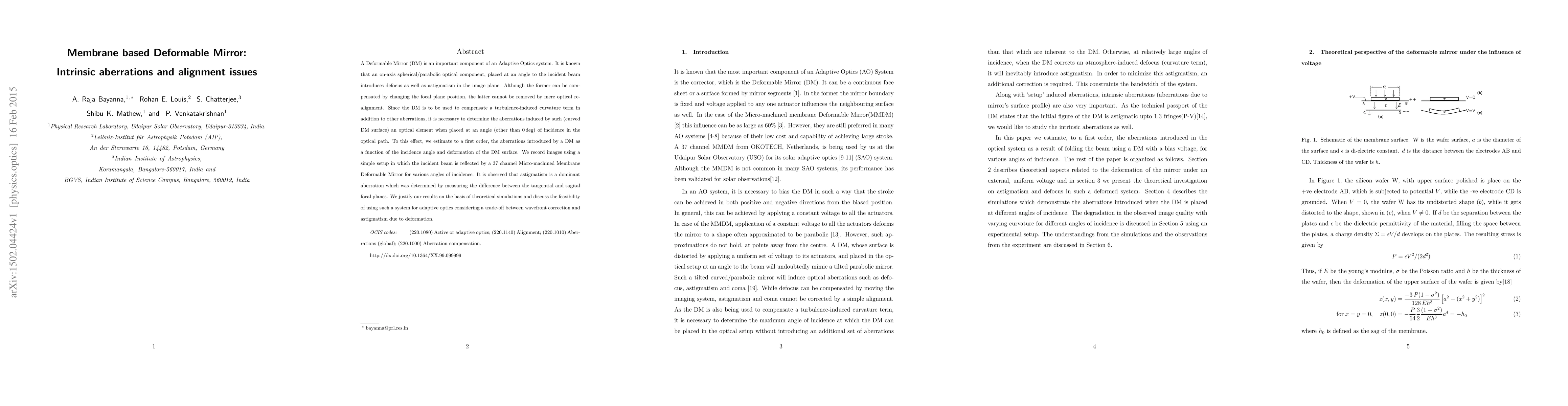 A Deformable Mirror (DM) is an important component of an Adaptive Optics system. It is known that an on-axis spherical/parabolic optical component, placed at an angle to the incident beam introduces defocus as well as astigmatism in the image plane. Although the former can be compensated by changing the focal plane position, the latter cannot be removed by mere optical re-alignment. Since the DM is to be used to compensate a turbulence-induced curvature term in addition to other aberrations, it is necessary to determine the aberrations induced by such (curved DM surface) an optical element when placed at an angle (other than 0 degree) of incidence in the optical path. To this effect, we estimate to a first order, the aberrations introduced by a DM as a function of the incidence angle and deformation of the DM surface. We record images using a simple setup in which the incident beam is reflected by a 37 channel Micro-machined Membrane Deformable Mirror for various angles of incidence. It is observed that astigmatism is a dominant aberration which was determined by measuring the difference between the tangential and sagital focal planes. We justify our results on the basis of theoretical simulations and discuss the feasibility of using such a system for adaptive optics considering a trade-off between wavefront correction and astigmatism due to deformation.