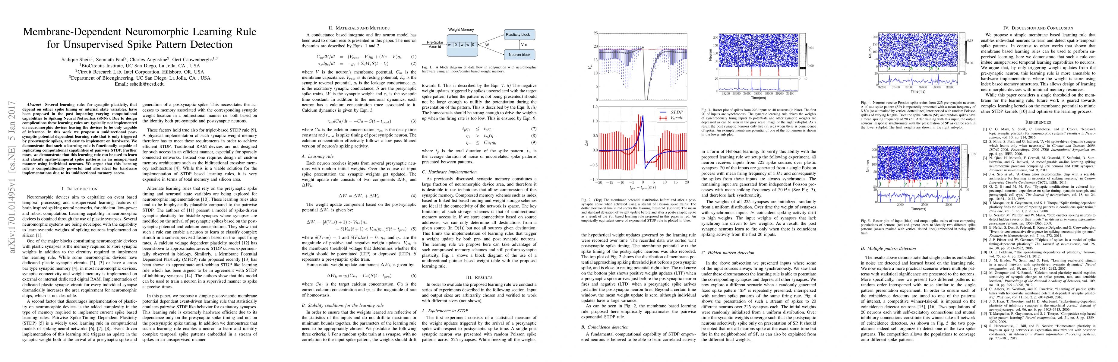 This paper proposes a new membrane-dependent neuromorphic learning rule for unsupervised spike pattern detection, which is easy to implement on neuromorphic hardware. The rule replicates the computational capabilities of pairwise spike-timing-dependent plasticity (STDP) and enables unsupervised learning and classification of spatio-temporal spike patterns.