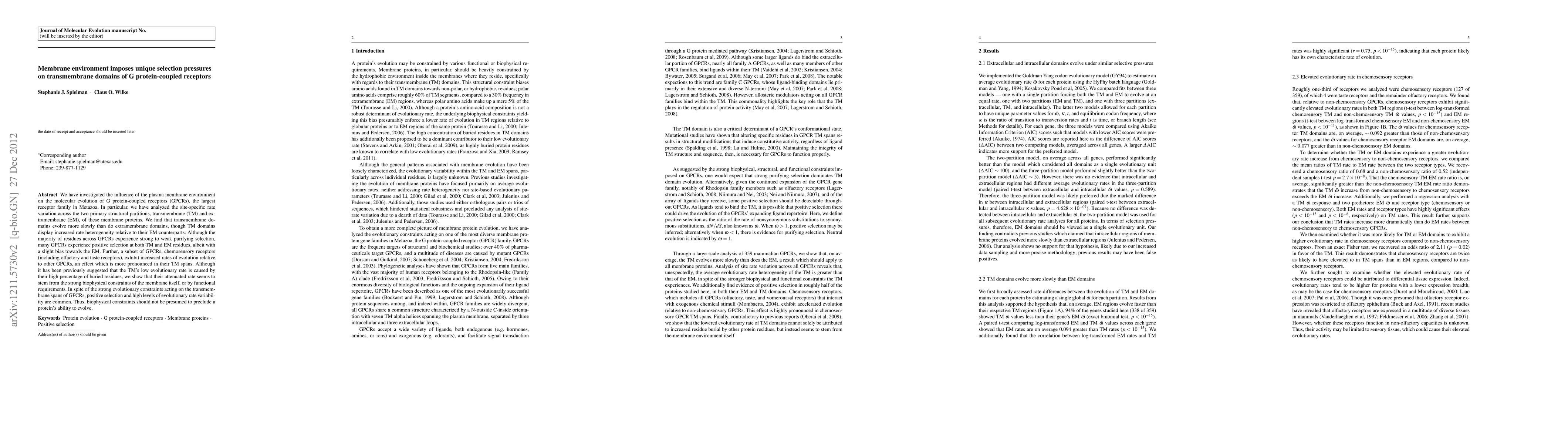 We have investigated the influence of the plasma membrane environment on the molecular evolution of G protein-coupled receptors (GPCRs), the largest receptor family in Metazoa. In particular, we have analyzed the site-specific rate variation across the two primary structural partitions, transmembrane (TM) and extramembrane (EM), of these membrane proteins. We find that transmembrane domains evolve more slowly than do extramembrane domains, though TM domains display increased rate heterogeneity relative to their EM counterparts. Although the majority of residues across GPCRs experience strong to weak purifying selection, many GPCRs experience positive selection at both TM and EM residues, albeit with a slight bias towards the EM. Further, a subset of GPCRs, chemosensory receptors (including olfactory and taste receptors), exhibit increased rates of evolution relative to other GPCRs, an effect which is more pronounced in their TM spans. Although it has been previously suggested that the TM's low evolutionary rate is caused by their high percentage of buried residues, we show that their attenuated rate seems to stem from the strong biophysical constraints of the membrane itself, or by functional requirements. In spite of the strong evolutionary constraints acting on the transmembrane spans of GPCRs, positive selection and high levels of evolutionary rate variability are common. Thus, biophysical constraints should not be presumed to preclude a protein's ability to evolve.