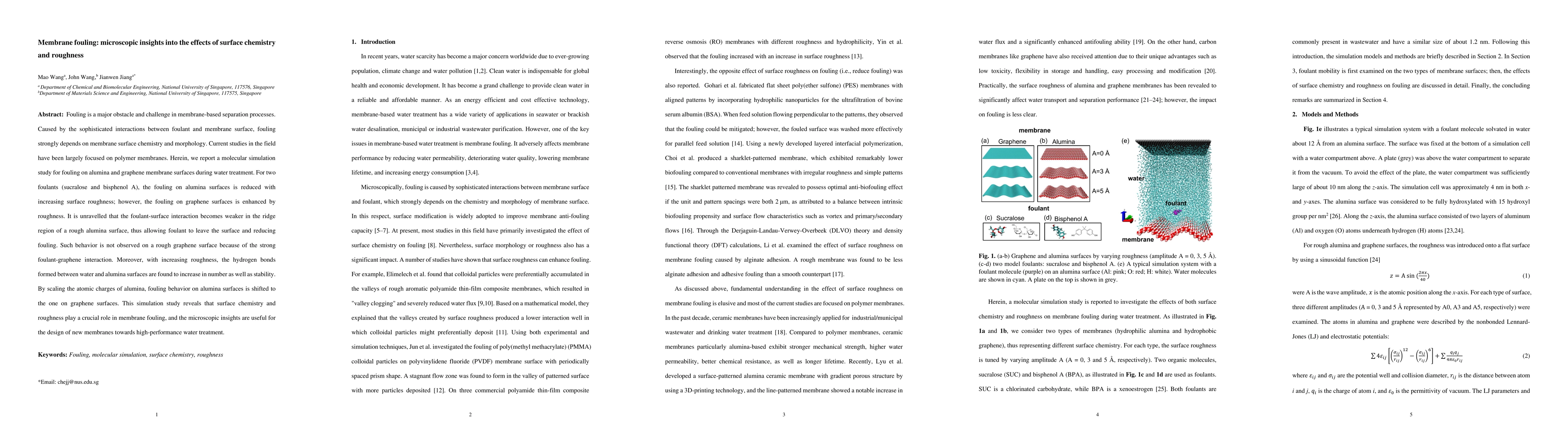 This study uses molecular simulations to investigate how surface chemistry and roughness affect membrane fouling on alumina and graphene membranes during water treatment. The results show that roughness reduces fouling on alumina due to weaker foulant-surface interactions, while it enhances fouling on graphene due to strong interactions, highlighting the importance of surface properties in membrane design for water treatment.