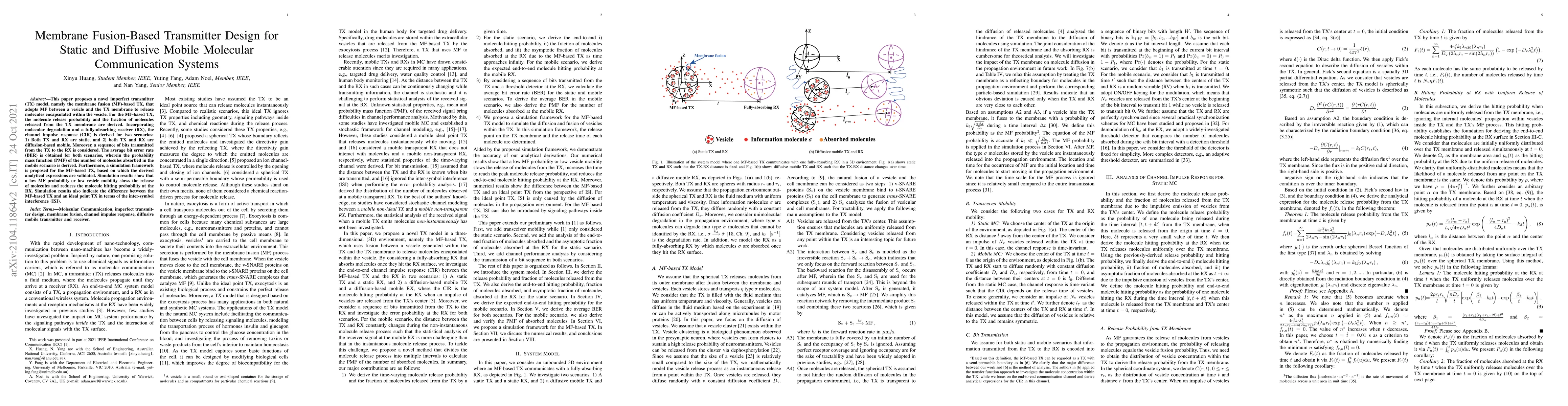 This research introduces a new transmitter model for molecular communication systems, using membrane fusion to release molecules. It derives expressions for molecule release probability and channel impulse response for static and diffusive mobile scenarios. The study also calculates average bit error rate and molecular absorption probability, validated through simulations. Results show that low membrane fusion probability or vesicle mobility reduces molecule release and hitting probability, highlighting differences with ideal point transmitters.