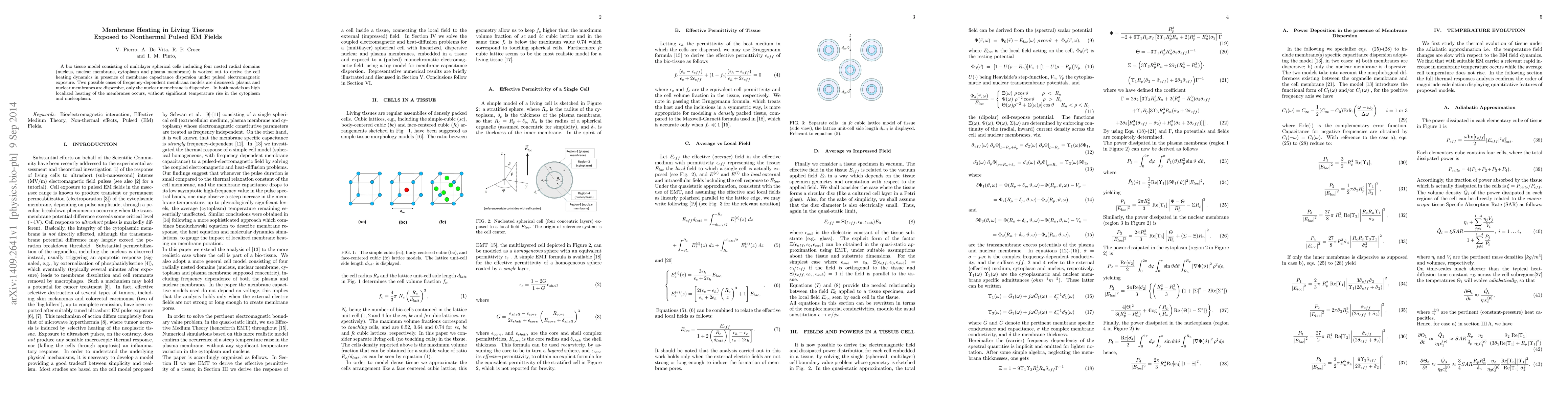 This research uses a detailed cell model to study how nonthermal pulsed electromagnetic fields affect living tissues, focusing on membrane heating. It finds that high localized heating occurs in membranes, while cytoplasm and nucleoplasm temperatures remain largely unchanged, regardless of whether plasma and nuclear membranes or just the nuclear membrane are frequency-dependent.