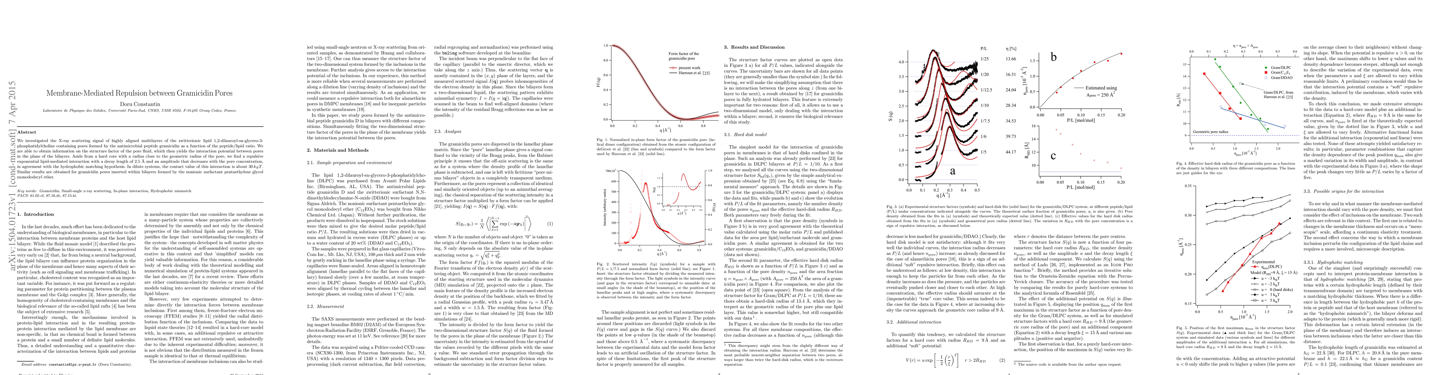 Research found that gramicidin pores repel each other due to lipid-mediated interactions, with a decay length of 2.5 Å and an amplitude decreasing with pore concentration.
