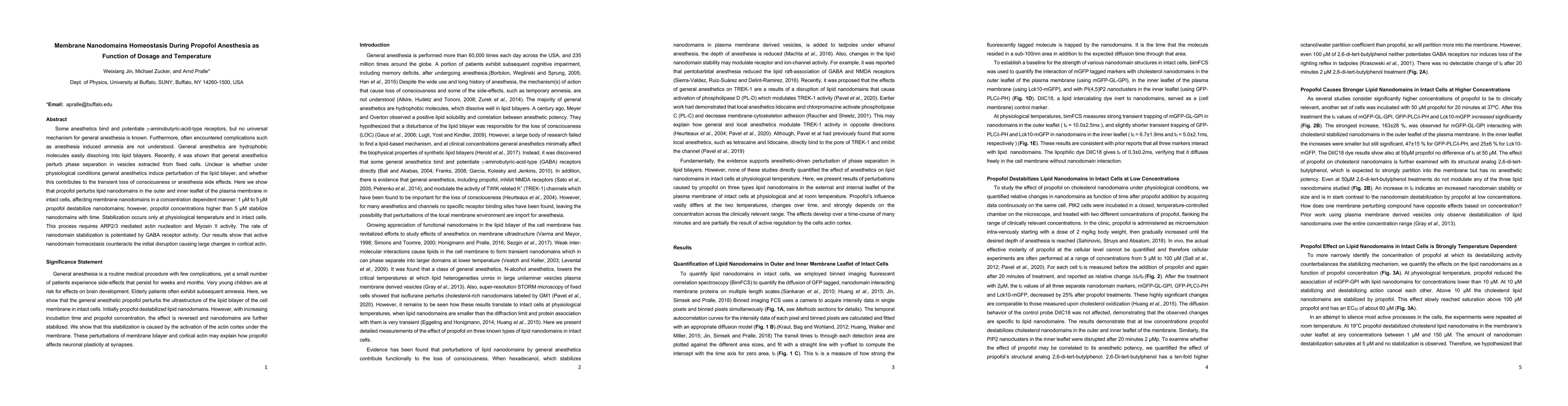 This study reveals that propofol, a general anesthetic, disrupts lipid nanodomains in cell membranes in a concentration-dependent manner, destabilizing them at lower doses and stabilizing them at higher doses, a process that requires actin nucleation and Myosin II activity, and is potentiated by GABA receptor activity.