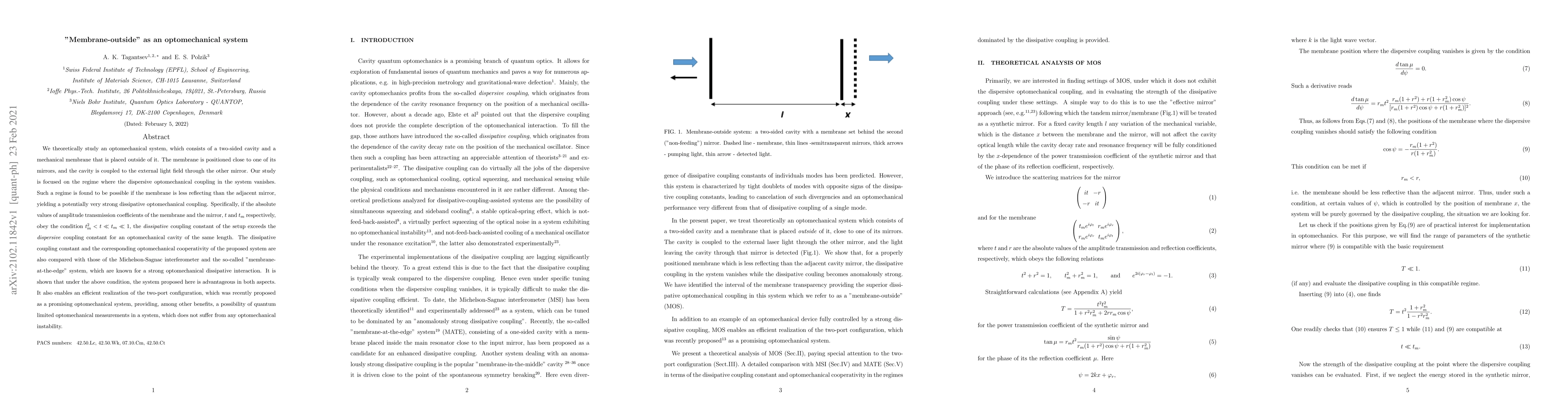 This paper theoretically explores an optomechanical system featuring a membrane outside a two-sided cavity, focusing on the regime where dispersive coupling is negligible. It finds that a less reflective membrane compared to the cavity mirror can yield strong dissipative optomechanical coupling, outperforming systems like the Michelson-Sagnac interferometer and "membrane-at-the-edge" systems. The proposed system enables efficient two-port configurations for quantum-limited optomechanical measurements without optomechanical instability.