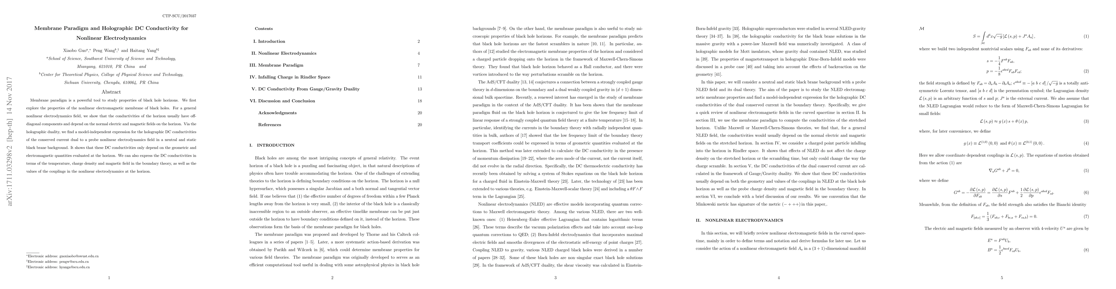 This paper explores the membrane paradigm to study the nonlinear electromagnetic properties of black hole horizons, revealing that horizon conductivities have off-diagonal components dependent on electric and magnetic fields. It derives a model-independent holographic expression for DC conductivities in a neutral black brane background, showing they depend on horizon geometric and electromagnetic quantities.