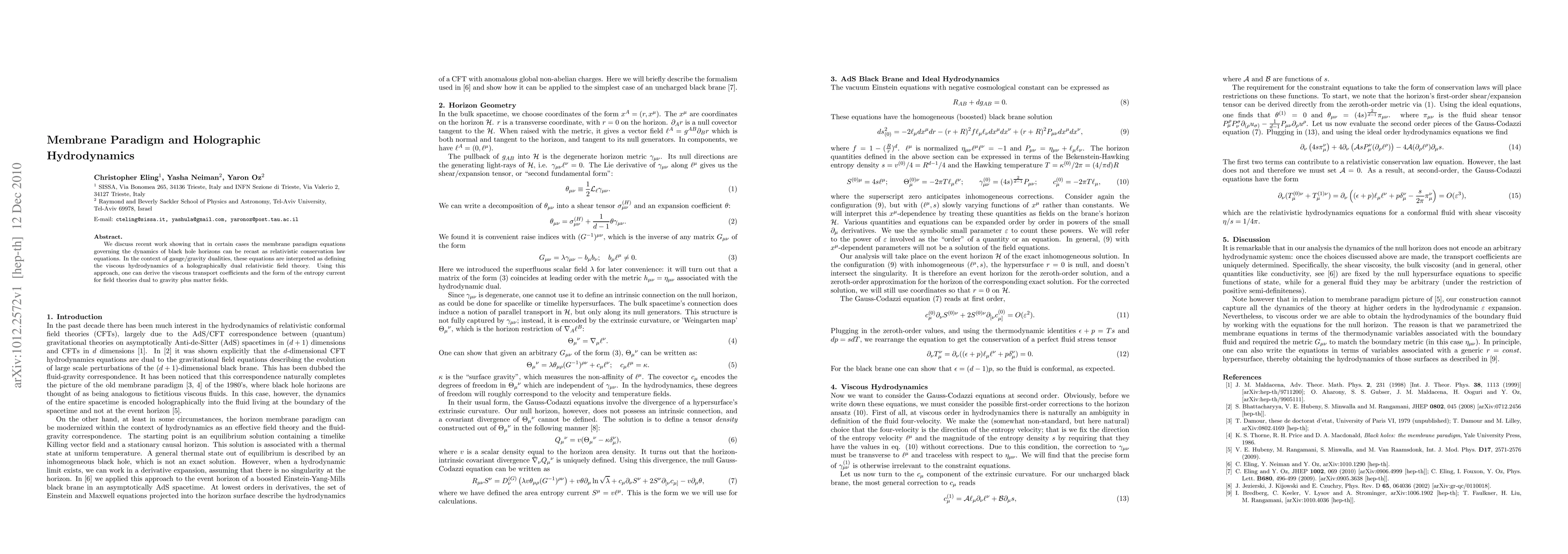 This paper recasts the membrane paradigm equations for black hole horizons as relativistic conservation laws, linking them to the hydrodynamics of holographic dual field theories. It derives the viscous transport coefficients and entropy current for these dual field theories.