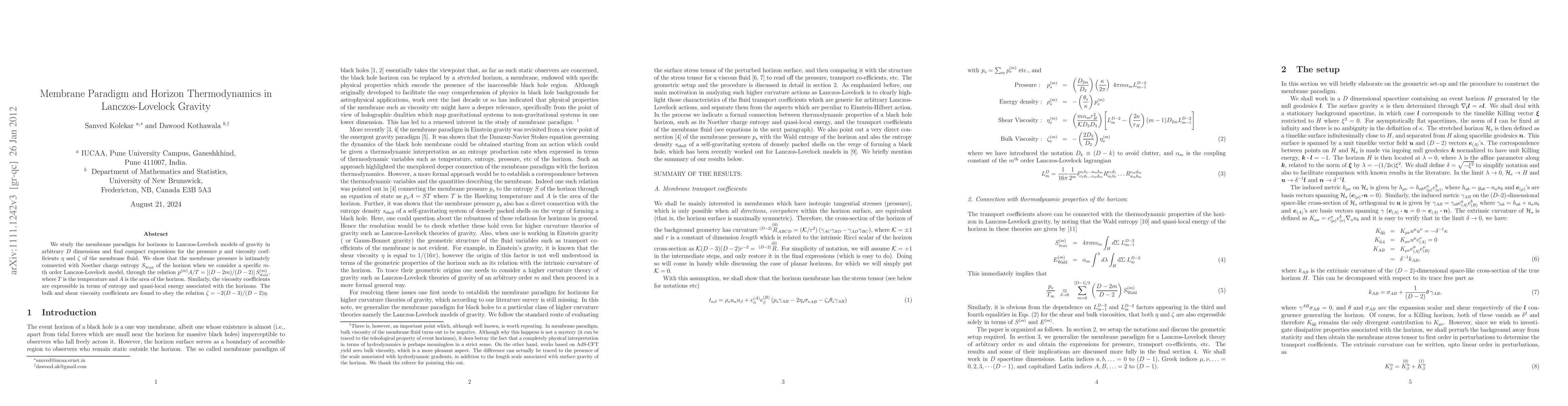 This paper investigates the membrane paradigm in Lanczos-Lovelock gravity, deriving expressions for pressure and viscosity coefficients in terms of horizon entropy and temperature. It reveals a connection between membrane pressure and Noether charge entropy, and establishes a relation for bulk and shear viscosities.