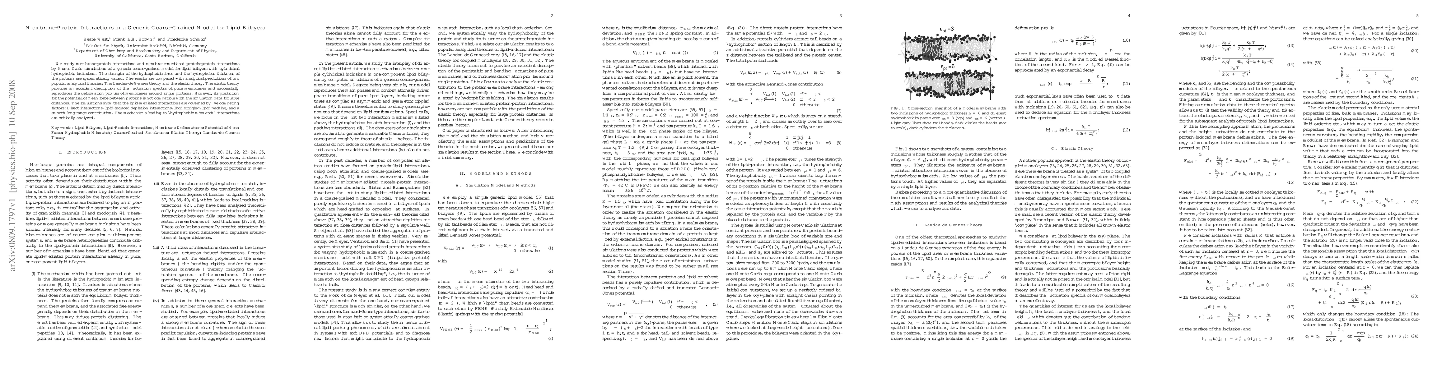 This paper investigates membrane-protein and protein-protein interactions using Monte Carlo simulations of a coarse-grained lipid bilayer model, revealing five key factors governing lipid-mediated interactions. The elastic theory accurately describes membrane fluctuations but fails to predict protein-protein interaction potentials at large distances.