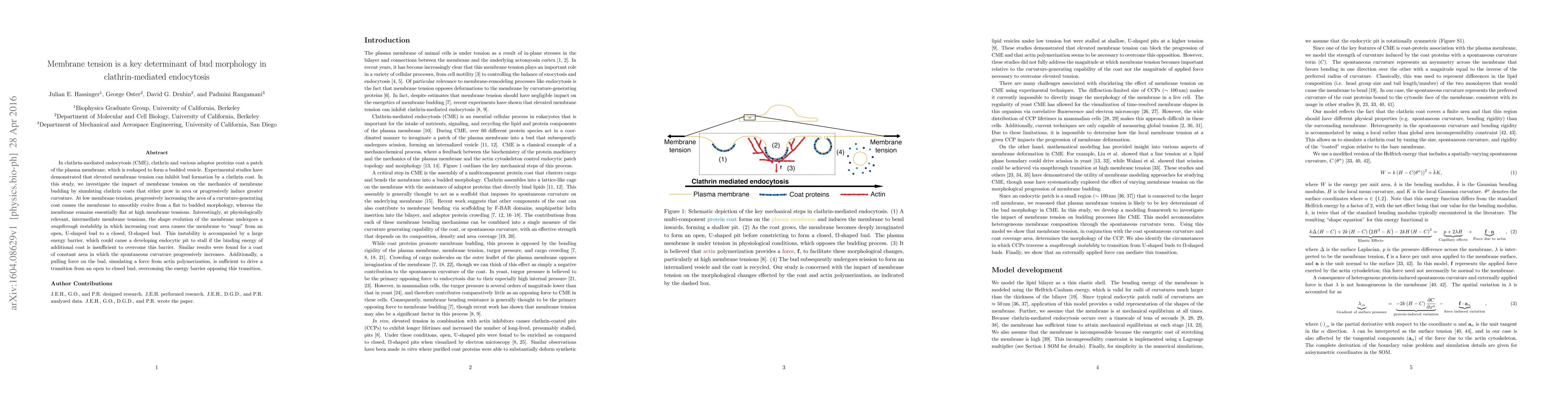 This study reveals that membrane tension critically influences the morphology of clathrin-mediated endocytic buds, with low tension allowing smooth transition to a budded shape, while high tension keeps the membrane flat. Intermediate tension induces a snap-through instability, creating a significant energy barrier that can stall bud formation.