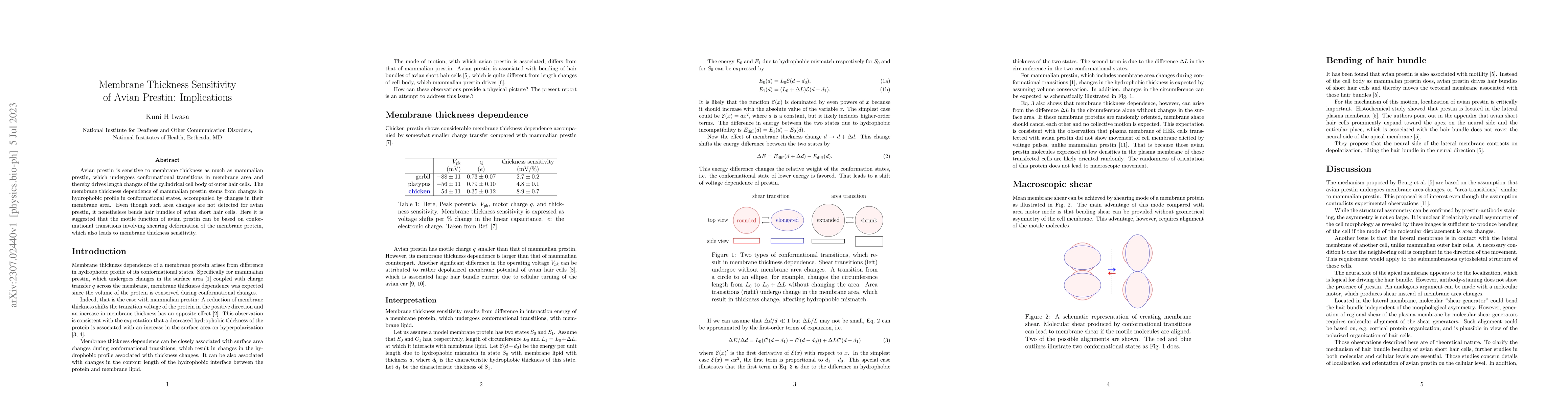 Avian prestin is sensitive to membrane thickness as much as mammalian prestin, which undergoes conformational transitions in membrane area and thereby drives length changes of the cylindrical cell body of outer hair cells. The membrane thickness dependence of mammalian prestin stems from changes in hydrophobic profile in conformational states, accompanied by changes in their membrane area. Even though such area changes are not detected for avian prestin, it nonetheless bends hair bundles of avian short hair cells. Here it is suggested that the motile function of avian prestin can be based on conformational transitions involving shearing deformation of the membrane protein, which also leads to membrane thickness sensitivity.