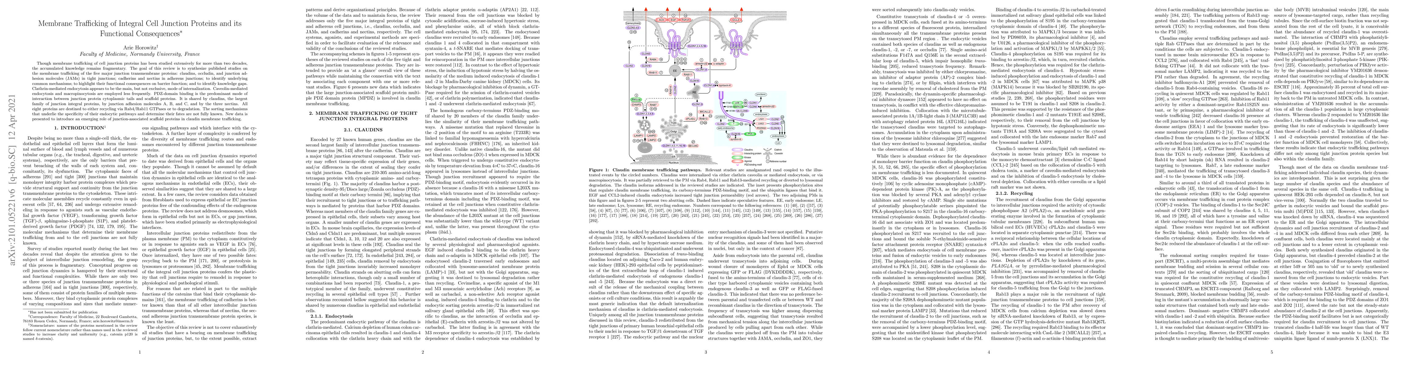 This review synthesizes existing research on membrane trafficking of cell junction proteins, revealing that clathrin-mediated endocytosis is the primary mode of internalization, with PDZ-domain binding playing a crucial role in protein interactions. The study highlights key findings on the functional consequences of membrane trafficking on barrier function and identifies knowledge gaps in understanding the sorting mechanisms underlying junction protein endocytic pathways.