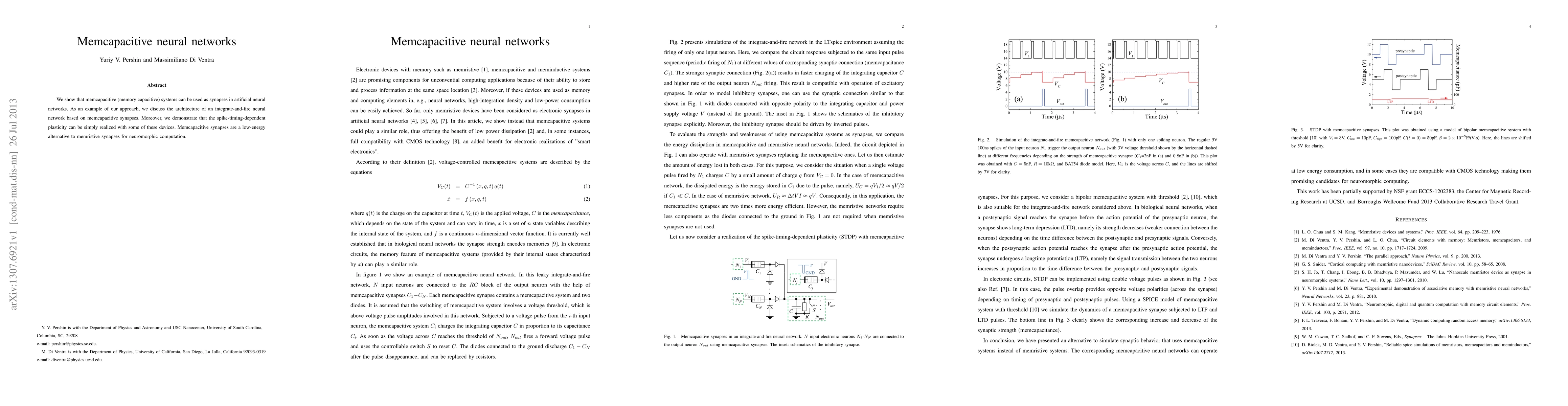 Memcapacitive systems are proposed as low-energy synaptic alternatives in artificial neural networks, specifically in an integrate-and-fire architecture. These memcapacitive synapses enable spike-timing-dependent plasticity, offering a viable low-energy option compared to memristive synapses for neuromorphic computation.