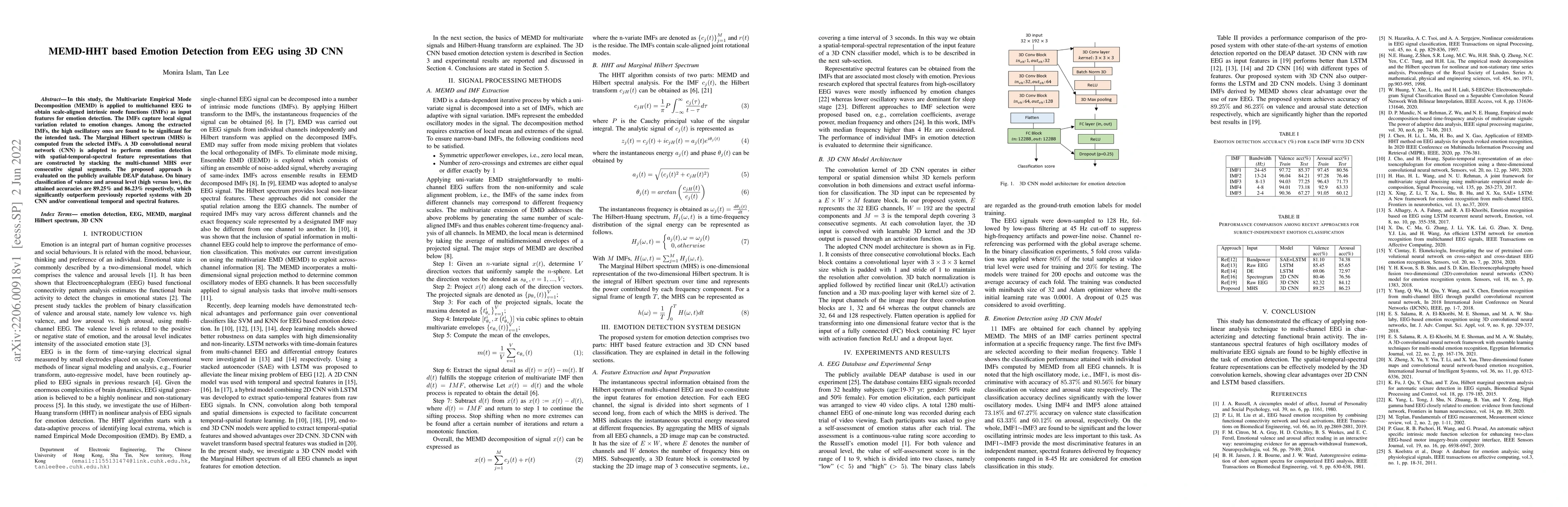 The paper presents a MEMD-HHT based feature extraction method combined with a 3D CNN for emotion detection from EEG, providing improved performance over traditional 2D CNN and spectral feature-based methods.