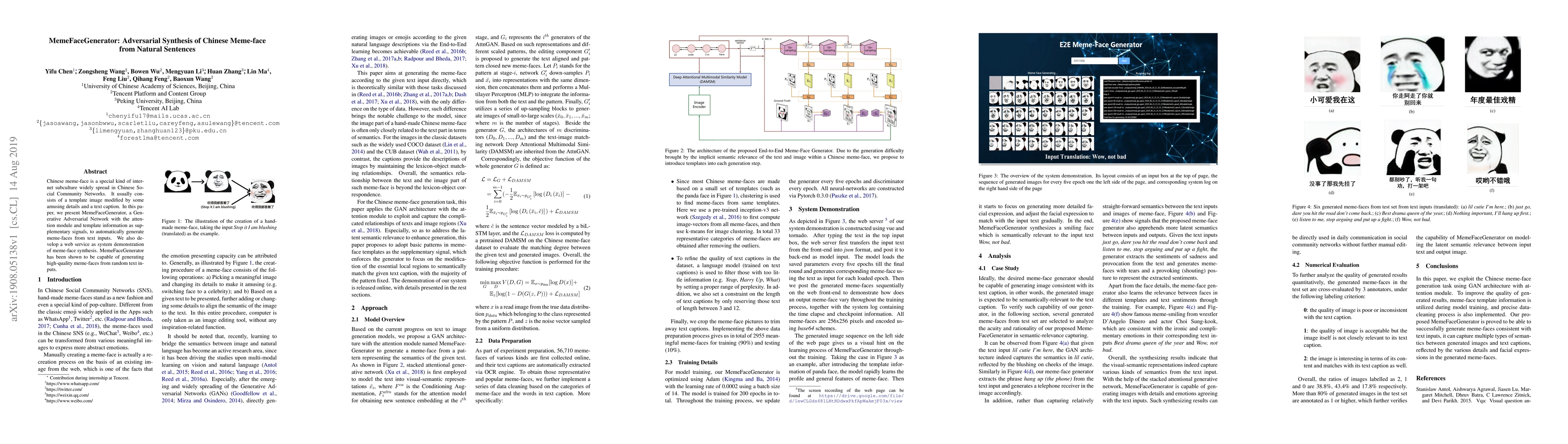 This paper introduces MemeFaceGenerator, a Generative Adversarial Network designed to automatically create Chinese meme-faces from natural sentences, incorporating an attention module and template information. The system demonstrates high-quality meme-face synthesis and includes a web service for demonstration.