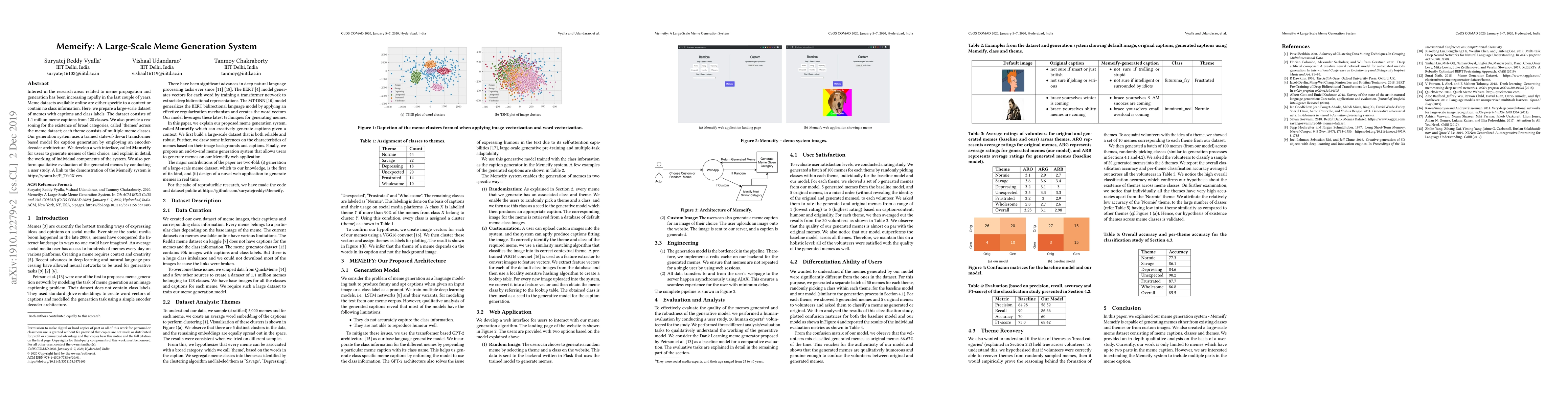 This paper presents Memeify, a large-scale meme generation system featuring a dataset of 1.1 million meme captions categorized into 128 classes. The system employs a transformer-based model for meme caption generation and includes a web interface for user interaction, supported by a qualitative user study evaluation.
