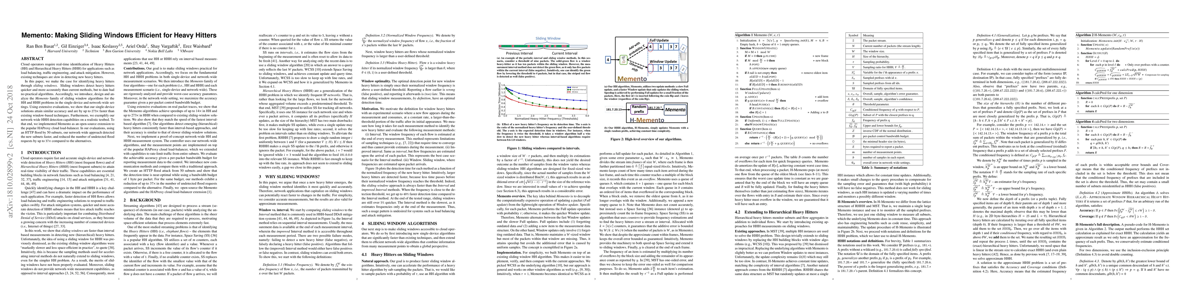 This paper introduces the Memento family of sliding window algorithms for efficiently identifying Heavy Hitters and Hierarchical Heavy Hitters in real-time. The proposed algorithms significantly outperform existing methods, achieving up to 273x faster detection and reducing undetected flood requests by up to 37x in network-wide settings.