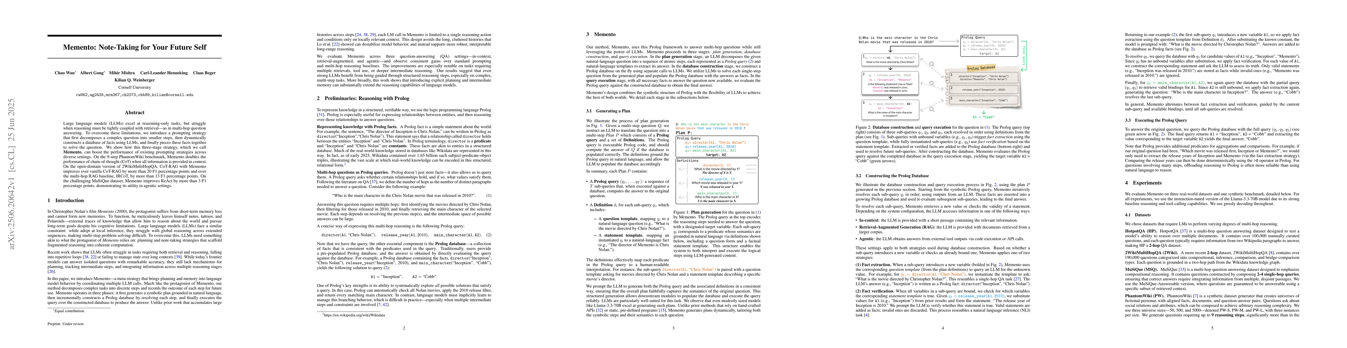 Large language models (LLMs) excel at reasoning-only tasks, but struggle when reasoning must be tightly coupled with retrieval, as in multi-hop question answering. To overcome these limitations, we introduce a prompting strategy that first decomposes a complex question into smaller steps, then dynamically constructs a database of facts using LLMs, and finally pieces these facts together to solve the question. We show how this three-stage strategy, which we call Memento, can boost the performance of existing prompting strategies across diverse settings. On the 9-step PhantomWiki benchmark, Memento doubles the performance of chain-of-thought (CoT) when all information is provided in context. On the open-domain version of 2WikiMultiHopQA, CoT-RAG with Memento improves over vanilla CoT-RAG by more than 20 F1 percentage points and over the multi-hop RAG baseline, IRCoT, by more than 13 F1 percentage points. On the challenging MuSiQue dataset, Memento improves ReAct by more than 3 F1 percentage points, demonstrating its utility in agentic settings.