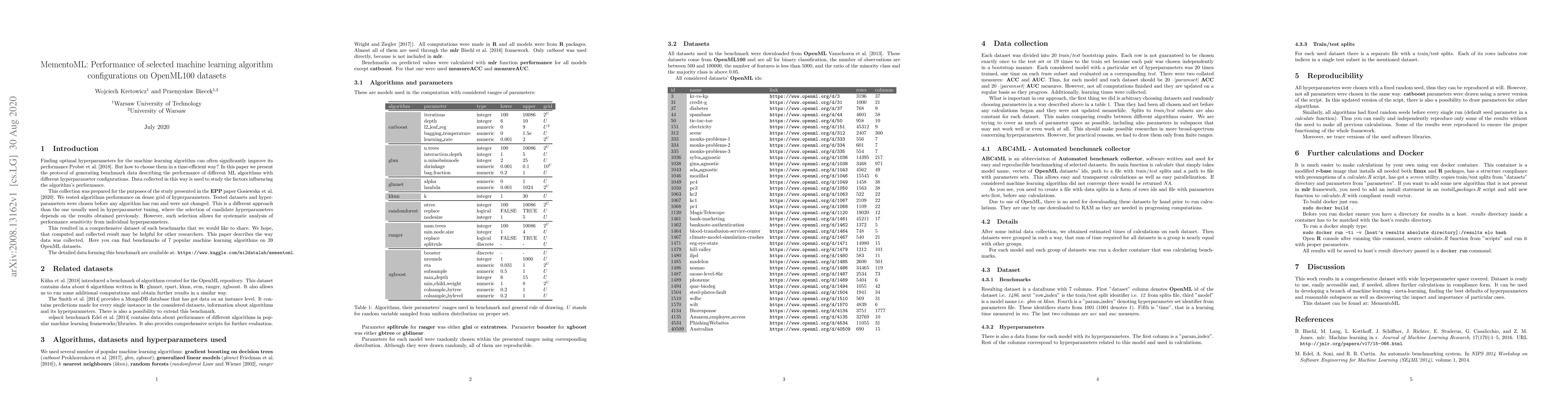 Finding optimal hyperparameters for the machine learning algorithm can often significantly improve its performance. But how to choose them in a time-efficient way? In this paper we present the protocol of generating benchmark data describing the performance of different ML algorithms with different hyperparameter configurations. Data collected in this way is used to study the factors influencing the algorithm's performance. This collection was prepared for the purposes of the study presented in the EPP study. We tested algorithms performance on dense grid of hyperparameters. Tested datasets and hyperparameters were chosen before any algorithm has run and were not changed. This is a different approach than the one usually used in hyperparameter tuning, where the selection of candidate hyperparameters depends on the results obtained previously. However, such selection allows for systematic analysis of performance sensitivity from individual hyperparameters. This resulted in a comprehensive dataset of such benchmarks that we would like to share. We hope, that computed and collected result may be helpful for other researchers. This paper describes the way data was collected. Here you can find benchmarks of 7 popular machine learning algorithms on 39 OpenML datasets. The detailed data forming this benchmark are available at: https://www.kaggle.com/mi2datalab/mementoml.