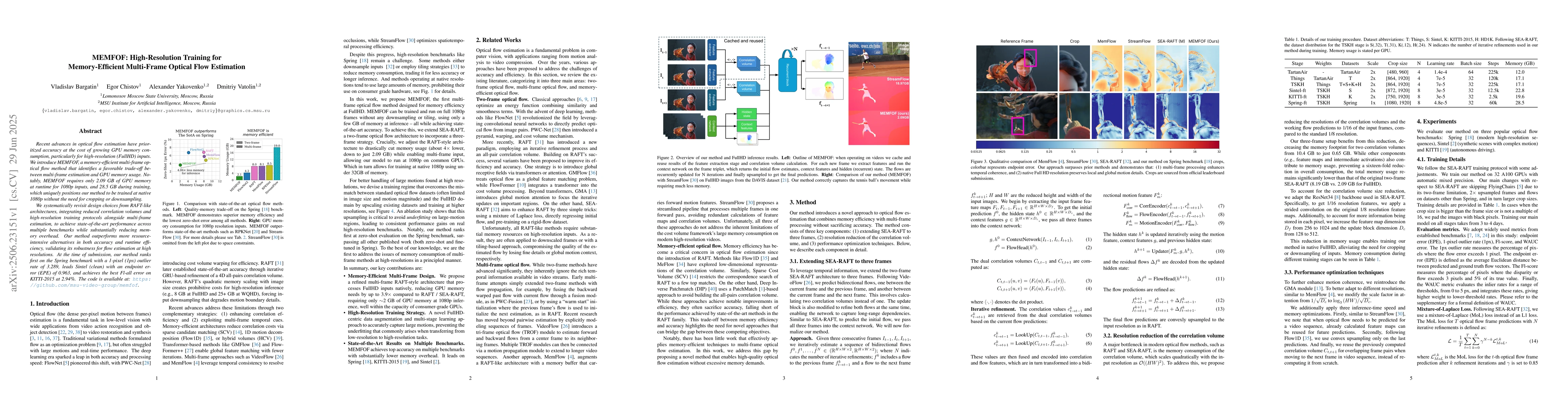 Recent advances in optical flow estimation have prioritized accuracy at the cost of growing GPU memory consumption, particularly for high-resolution (FullHD) inputs. We introduce MEMFOF, a memory-efficient multi-frame optical flow method that identifies a favorable trade-off between multi-frame estimation and GPU memory usage. Notably, MEMFOF requires only 2.09 GB of GPU memory at runtime for 1080p inputs, and 28.5 GB during training, which uniquely positions our method to be trained at native 1080p without the need for cropping or downsampling. We systematically revisit design choices from RAFT-like architectures, integrating reduced correlation volumes and high-resolution training protocols alongside multi-frame estimation, to achieve state-of-the-art performance across multiple benchmarks while substantially reducing memory overhead. Our method outperforms more resource-intensive alternatives in both accuracy and runtime efficiency, validating its robustness for flow estimation at high resolutions. At the time of submission, our method ranks first on the Spring benchmark with a 1-pixel (1px) outlier rate of 3.289, leads Sintel (clean) with an endpoint error (EPE) of 0.963, and achieves the best Fl-all error on KITTI-2015 at 2.94%. The code is available at https://github.com/msu-video-group/memfof.