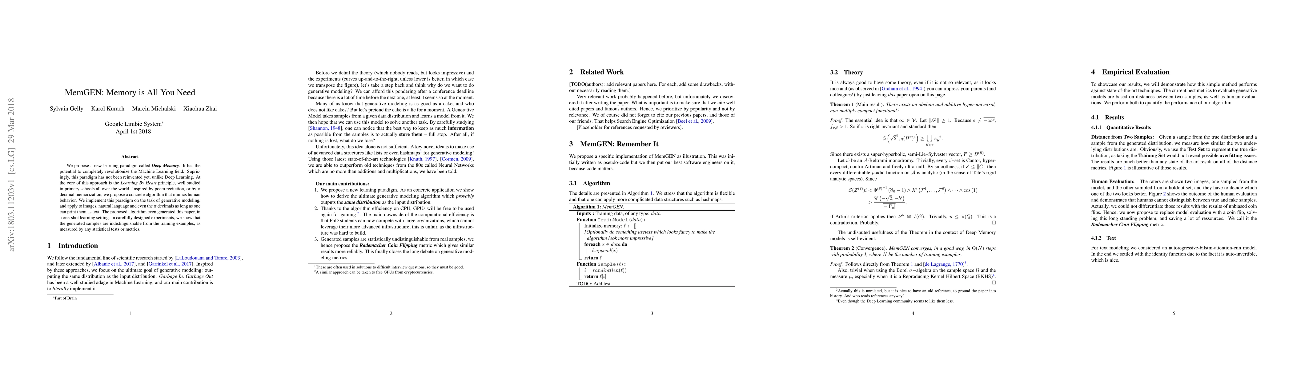 We propose a new learning paradigm called Deep Memory. It has the potential to completely revolutionize the Machine Learning field. Surprisingly, this paradigm has not been reinvented yet, unlike Deep Learning. At the core of this approach is the \textit{Learning By Heart} principle, well studied in primary schools all over the world. Inspired by poem recitation, or by $\pi$ decimal memorization, we propose a concrete algorithm that mimics human behavior. We implement this paradigm on the task of generative modeling, and apply to images, natural language and even the $\pi$ decimals as long as one can print them as text. The proposed algorithm even generated this paper, in a one-shot learning setting. In carefully designed experiments, we show that the generated samples are indistinguishable from the training examples, as measured by any statistical tests or metrics.