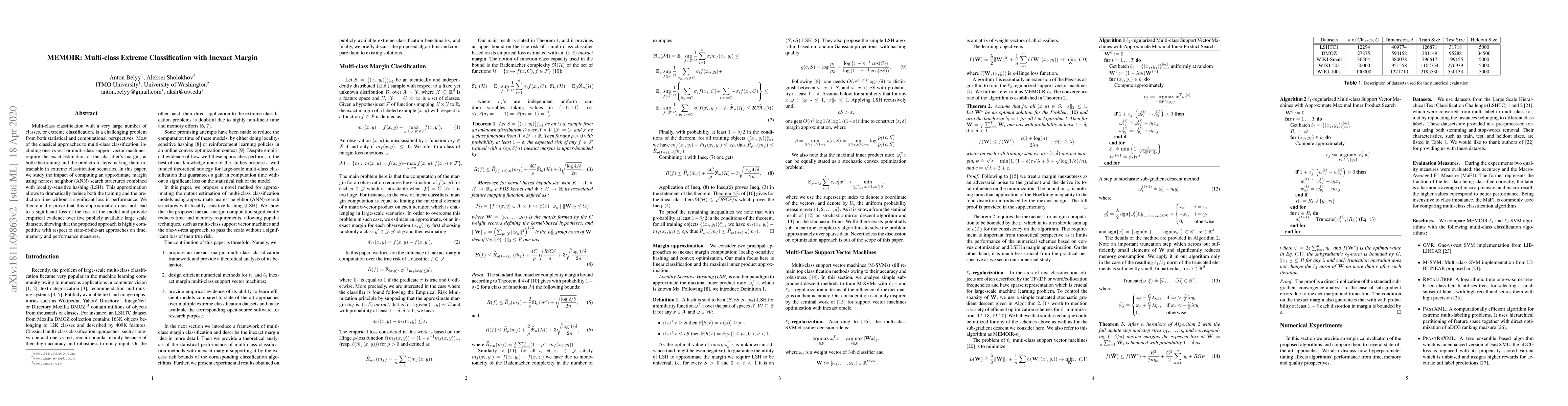 This paper proposes MEMOIR, a method for multi-class extreme classification that approximates the classifier's margin using nearest neighbor search and locality-sensitive hashing. This approach significantly reduces training and prediction time without substantial performance loss, as demonstrated on large-scale datasets.