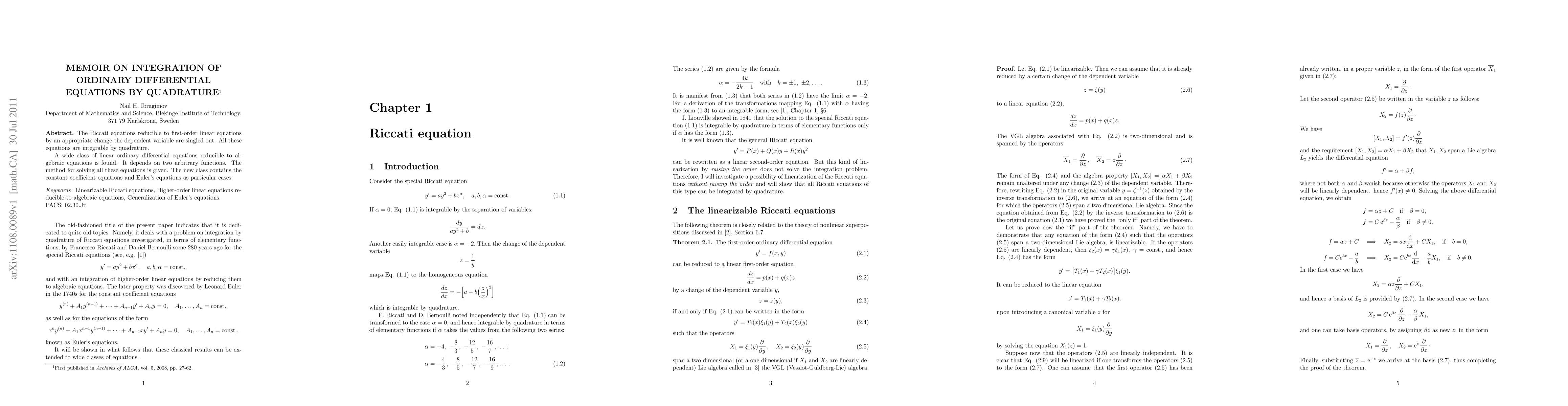 This paper identifies a class of Riccati equations integrable by quadrature via a change of dependent variable. It also discovers a broad category of linear ODEs reducible to algebraic equations, dependent on two arbitrary functions, with a provided solution method. This class includes constant coefficient and Euler's equations.