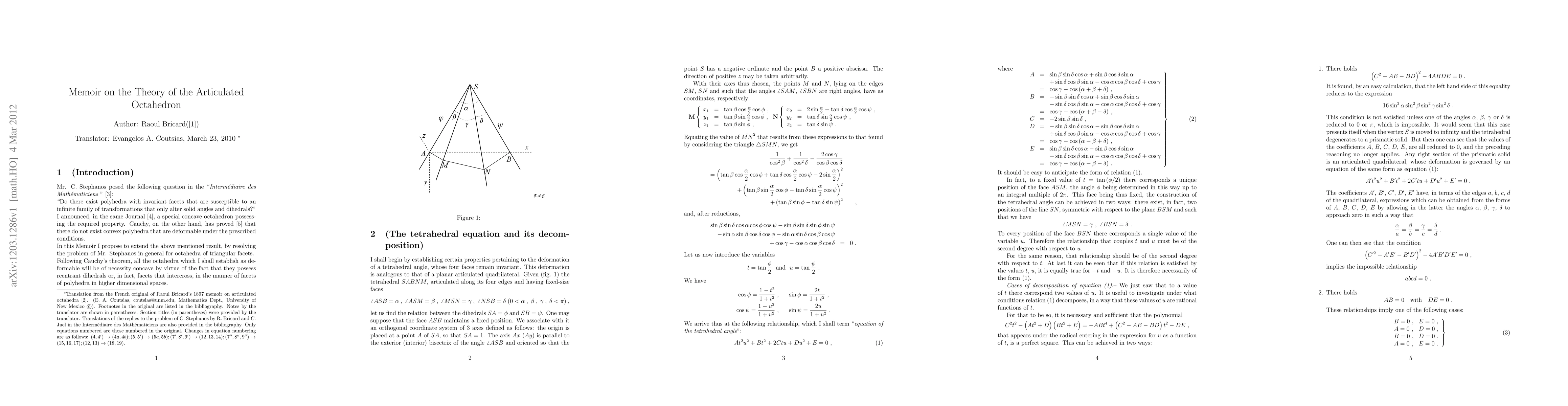 Mr. C. Stephanos posed the following question in the Interm\'ediaire des Math\'ematiciens: "Do there exist polyhedra with invariant facets that are susceptible to an infinite family of transformations that only alter solid angles and dihedrals?" I announced, in the same Journal, a special concave octahedron possessing the required property. Cauchy, on the other hand, has proved that there do not exist convex polyhedra that are deformable under the prescribed conditions. In this Memoir I propose to extend the above mentioned result, by resolving the problem of Mr. Stephanos in general for octahedra of triangular facets. Following Cauchy's theorem, all the octahedra which I shall establish as deformable will be of necessity concave by virtue of the fact that they possess reentrant dihedrals or, in fact, facets that intercross, in the manner of facets of polyhedra in higher dimensional spaces.