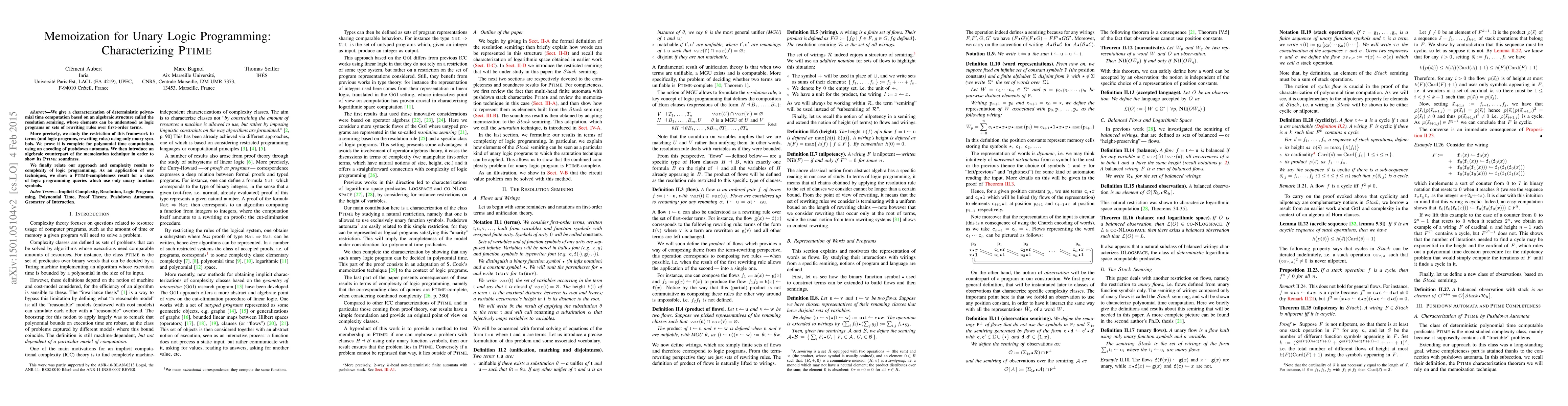 This paper characterizes deterministic polynomial time computation through an algebraic structure called the resolution semiring, focusing on unary logic programs. It proves the framework's completeness for polynomial time computation using pushdown automata encoding and introduces an algebraic memoization technique to demonstrate PTIME soundness.