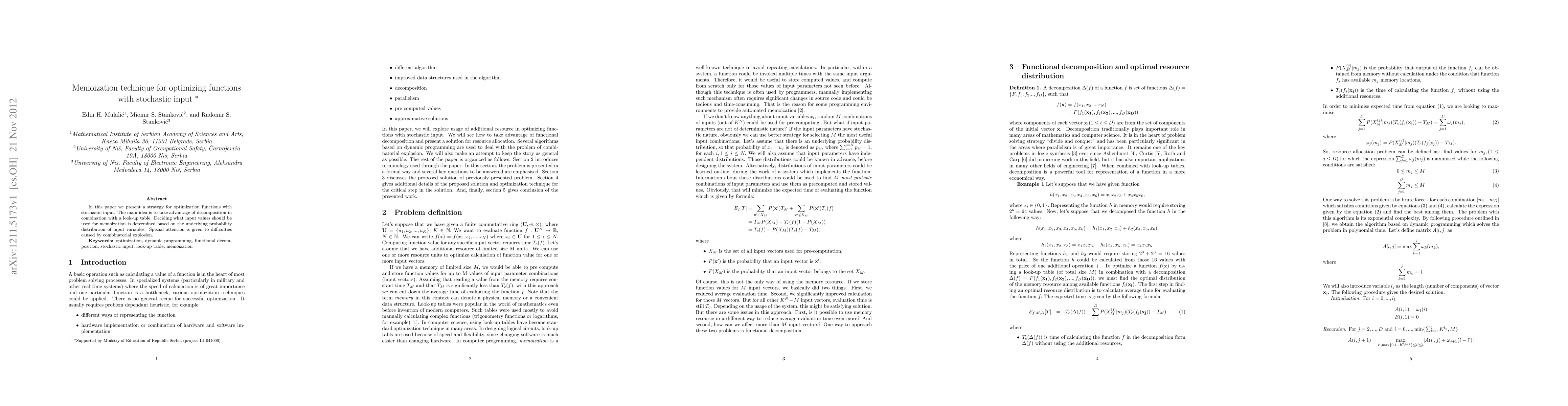 In this paper we present a strategy for optimization functions with stochastic input. The main idea is to take advantage of decomposition in combination with a look-up table. Deciding what input values should be used for memoization is determined based on the underlying probability distribution of input variables. Special attention is given to difficulties caused by combinatorial explosion.