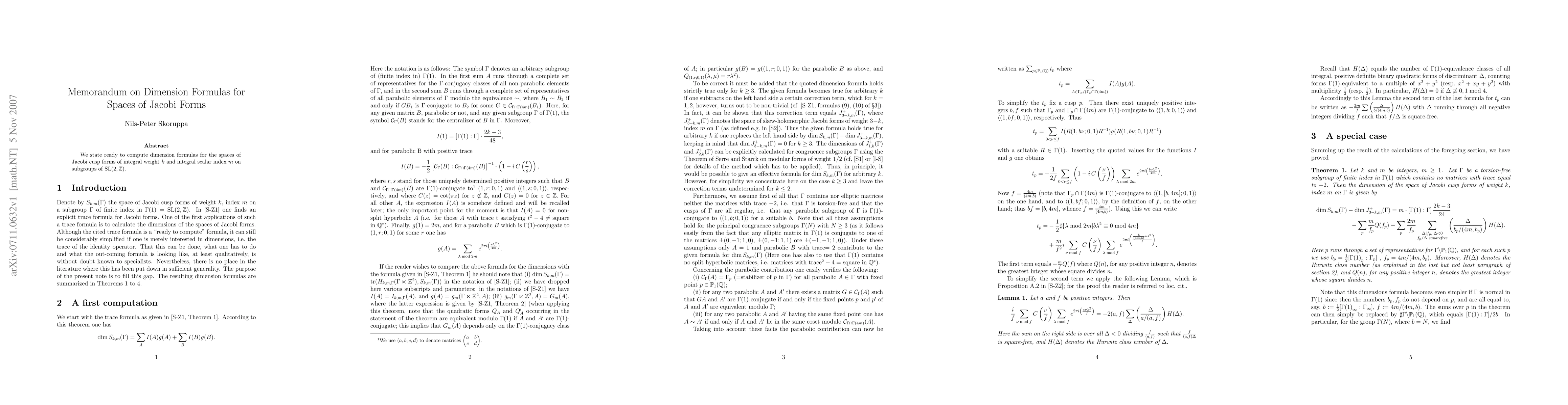 We state ready to compute dimension formulas for the spaces of Jacobi cusp forms of integral weight $k$ and integral scalar index $m$ on subgroups of $\SL$.