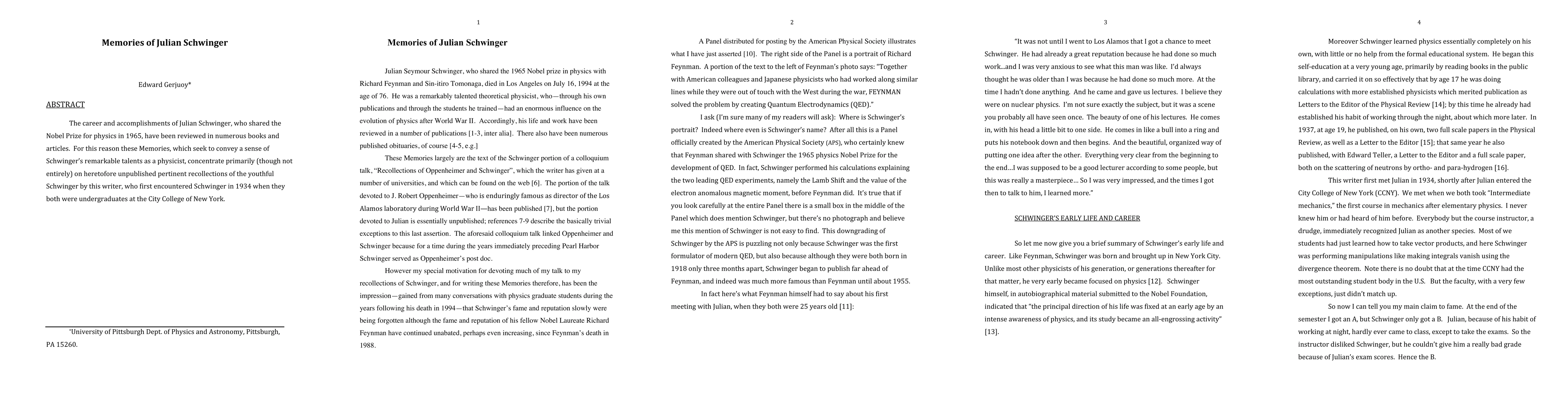 The career and accomplishments of Julian Schwinger, who shared the Nobel Prize for physics in 1965, have been reviewed in numerous books and articles. For this reason these Memories, which seek to convey a sense of Schwinger's remarkable talents as a physicist, concentrate primariy (though not entirely) on heretofore unpublished pertinent recollections of the youthful Schwinger by this writer, who first encountered Schwinger in 1934 when they both were undergraduates at the City College of New York.