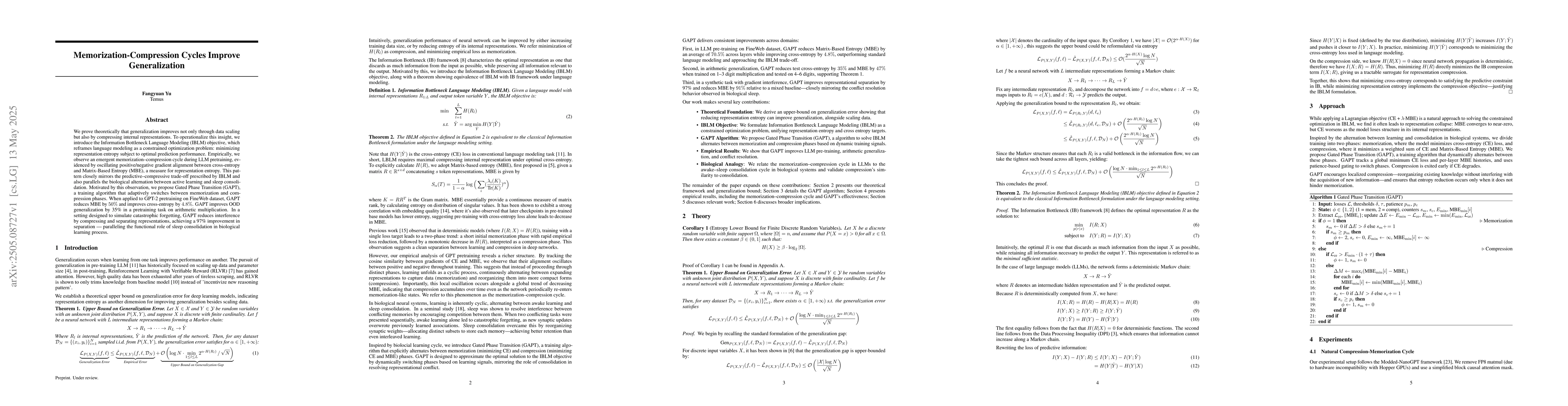 We prove theoretically that generalization improves not only through data scaling but also by compressing internal representations. To operationalize this insight, we introduce the Information Bottleneck Language Modeling (IBLM) objective, which reframes language modeling as a constrained optimization problem: minimizing representation entropy subject to optimal prediction performance. Empirically, we observe an emergent memorization-compression cycle during LLM pretraining, evidenced by oscillation positive/negative gradient alignment between cross-entropy and Matrix-Based Entropy (MBE), a measure of representation entropy. This pattern closely mirrors the predictive-compressive trade-off prescribed by IBLM and also parallels the biological alternation between awake learning and sleep consolidation. Motivated by this observation, we propose Gated Phase Transition (GAPT), a training algorithm that adaptively switches between memorization and compression phases. When applied to GPT-2 pretraining on FineWeb dataset, GAPT reduces MBE by 50% and improves cross-entropy by 4.8%. GAPT improves OOD generalizatino by 35% in a pretraining task on arithmetic multiplication. In a setting designed to simulate catastrophic forgetting, GAPT reduces interference by compressing and separating representations, achieving a 97% improvement in separation - paralleling the functional role of sleep consolidation.