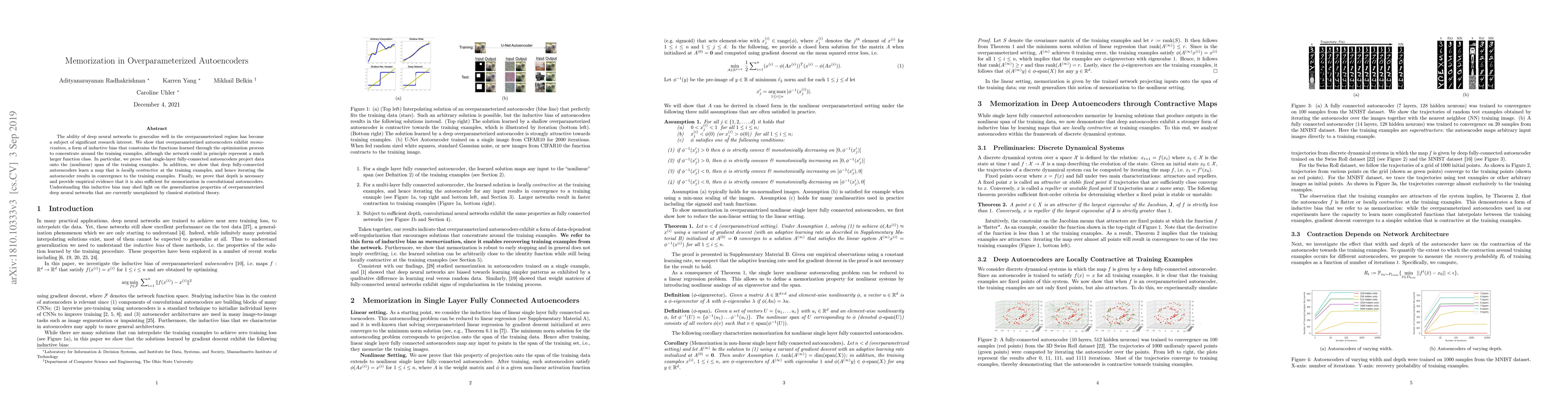 This paper investigates memorization in overparameterized autoencoders, demonstrating that despite their capacity to represent a large function class, they tend to concentrate learned functions around training examples. The study proves that both single-layer and deep autoencoders exhibit this inductive bias, with depth being essential for memorization in convolutional autoencoders.