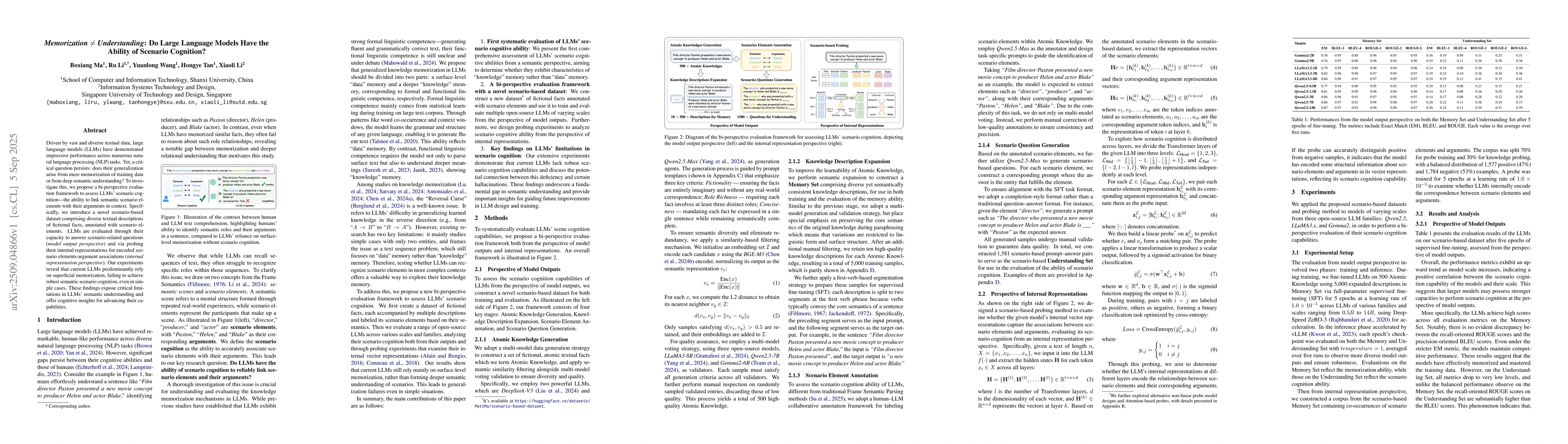 Driven by vast and diverse textual data, large language models (LLMs) have demonstrated impressive performance across numerous natural language processing (NLP) tasks. Yet, a critical question persists: does their generalization arise from mere memorization of training data or from deep semantic understanding? To investigate this, we propose a bi-perspective evaluation framework to assess LLMs' scenario cognition - the ability to link semantic scenario elements with their arguments in context. Specifically, we introduce a novel scenario-based dataset comprising diverse textual descriptions of fictional facts, annotated with scenario elements. LLMs are evaluated through their capacity to answer scenario-related questions (model output perspective) and via probing their internal representations for encoded scenario elements-argument associations (internal representation perspective). Our experiments reveal that current LLMs predominantly rely on superficial memorization, failing to achieve robust semantic scenario cognition, even in simple cases. These findings expose critical limitations in LLMs' semantic understanding and offer cognitive insights for advancing their capabilities.