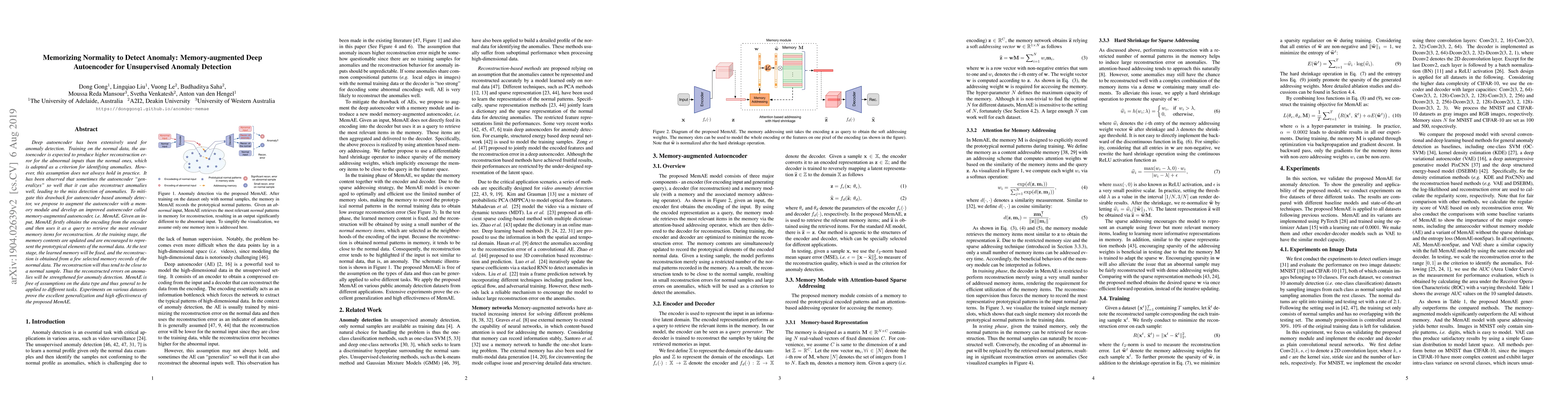 This paper proposes a memory-augmented deep autoencoder (MemAE) for unsupervised anomaly detection, which enhances the autoencoder with a memory module to better distinguish anomalies by retrieving prototypical normal data representations for reconstruction. Experiments demonstrate MemAE's effectiveness across various datasets.