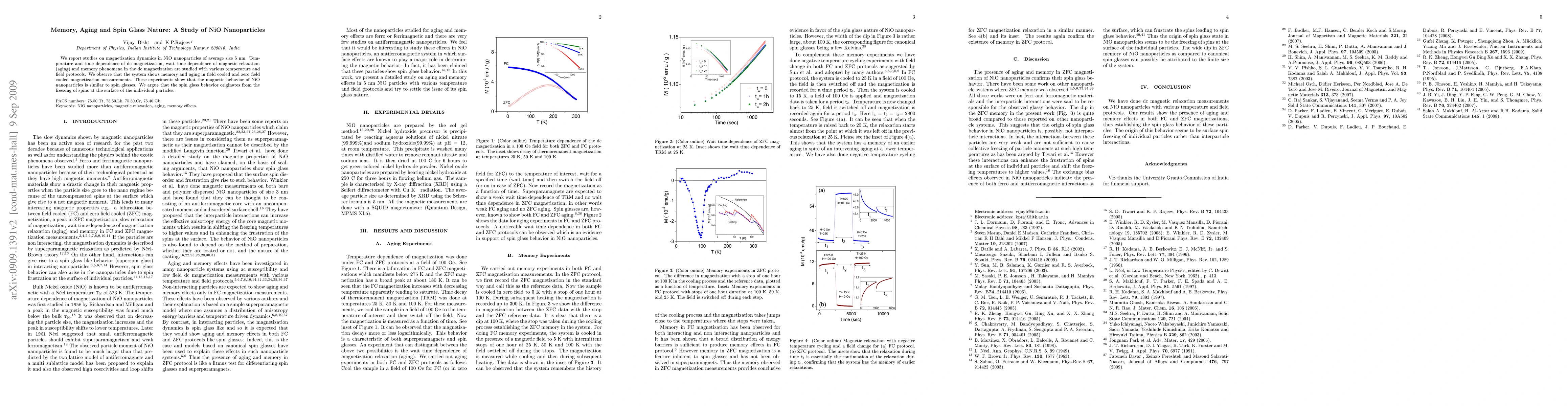 This study investigates magnetization dynamics in 5 nm NiO nanoparticles, revealing memory and aging effects akin to spin glasses. The observed behavior is attributed to the freezing of spins at the particle surfaces, suggesting a spin glass nature in the magnetic response of the nanoparticles.