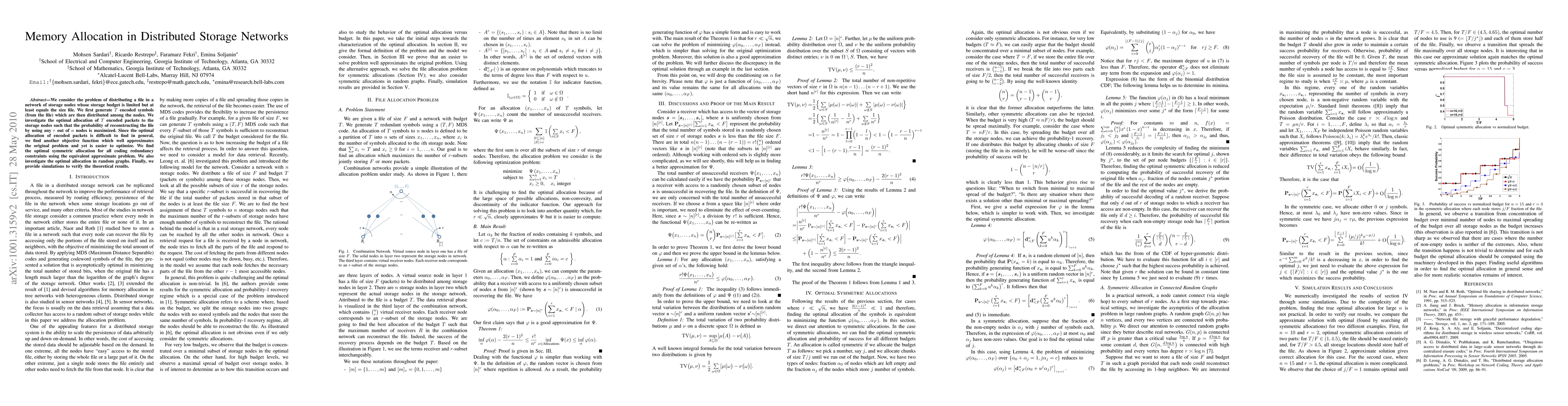 This research investigates optimal methods for distributing a file across a network of storage nodes with limited capacity. It introduces an approximate optimization problem to simplify finding the best allocation of encoded file fragments, ensuring high reconstruction probability with any subset of nodes. The study also explores optimal allocation in random graphs and validates findings through simulations.