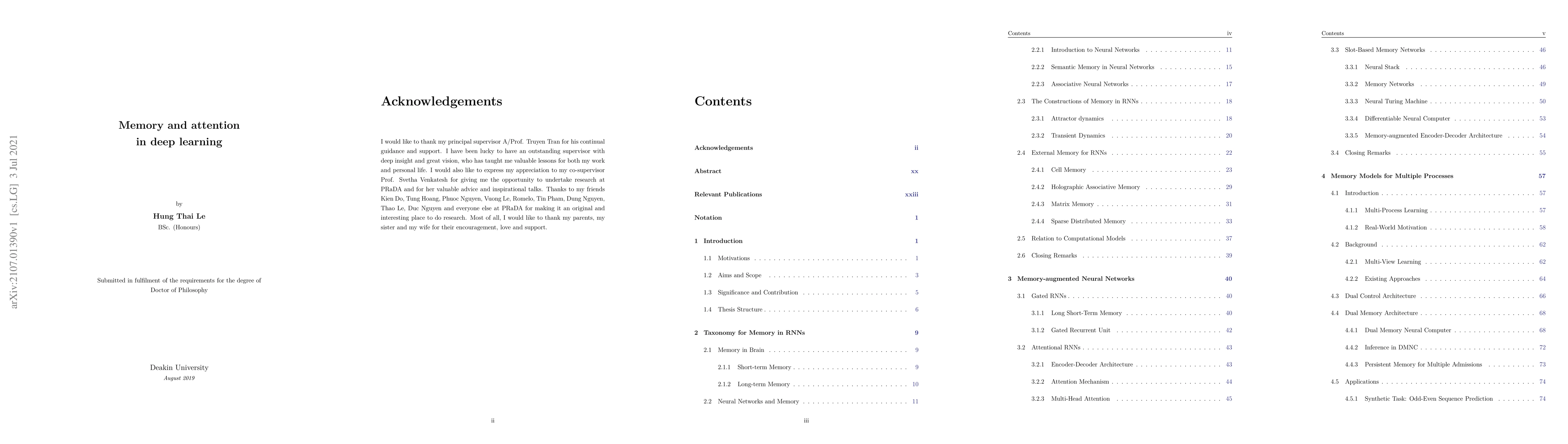 Intelligence necessitates memory. Without memory, humans fail to perform various nontrivial tasks such as reading novels, playing games or solving maths. As the ultimate goal of machine learning is to derive intelligent systems that learn and act automatically just like human, memory construction for machine is inevitable. Artificial neural networks model neurons and synapses in the brain by interconnecting computational units via weights, which is a typical class of machine learning algorithms that resembles memory structure. Their descendants with more complicated modeling techniques (a.k.a deep learning) have been successfully applied to many practical problems and demonstrated the importance of memory in the learning process of machinery systems. Recent progresses on modeling memory in deep learning have revolved around external memory constructions, which are highly inspired by computational Turing models and biological neuronal systems. Attention mechanisms are derived to support acquisition and retention operations on the external memory. Despite the lack of theoretical foundations, these approaches have shown promises to help machinery systems reach a higher level of intelligence. The aim of this thesis is to advance the understanding on memory and attention in deep learning. Its contributions include: (i) presenting a collection of taxonomies for memory, (ii) constructing new memory-augmented neural networks (MANNs) that support multiple control and memory units, (iii) introducing variability via memory in sequential generative models, (iv) searching for optimal writing operations to maximise the memorisation capacity in slot-based memory networks, and (v) simulating the Universal Turing Machine via Neural Stored-program Memory-a new kind of external memory for neural networks.