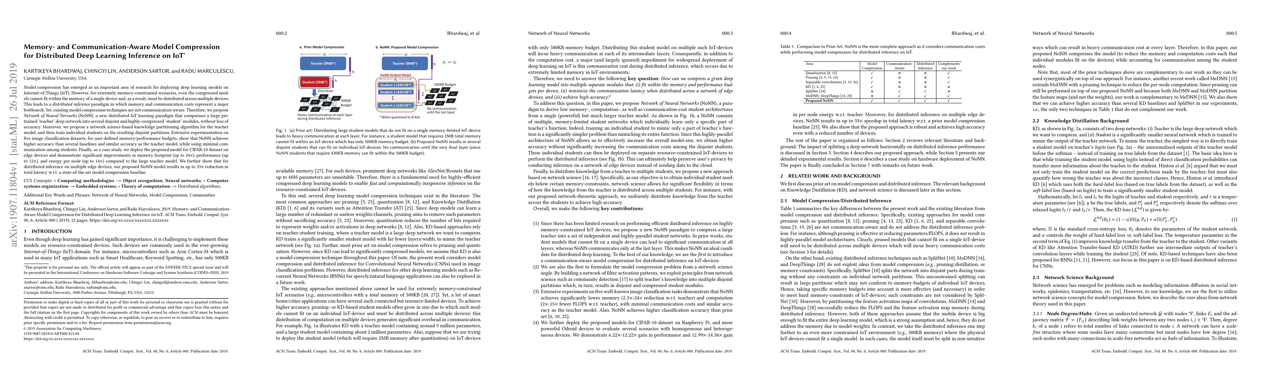 This paper proposes a memory- and communication-aware model compression technique called Network of Neural Networks (NoNN) for distributed deep learning inference on IoT devices. NoNN compresses a large pretrained model into smaller, highly-compressed modules, achieving higher accuracy with minimal communication costs, and significantly improving memory footprint, performance, and energy efficiency on edge devices.