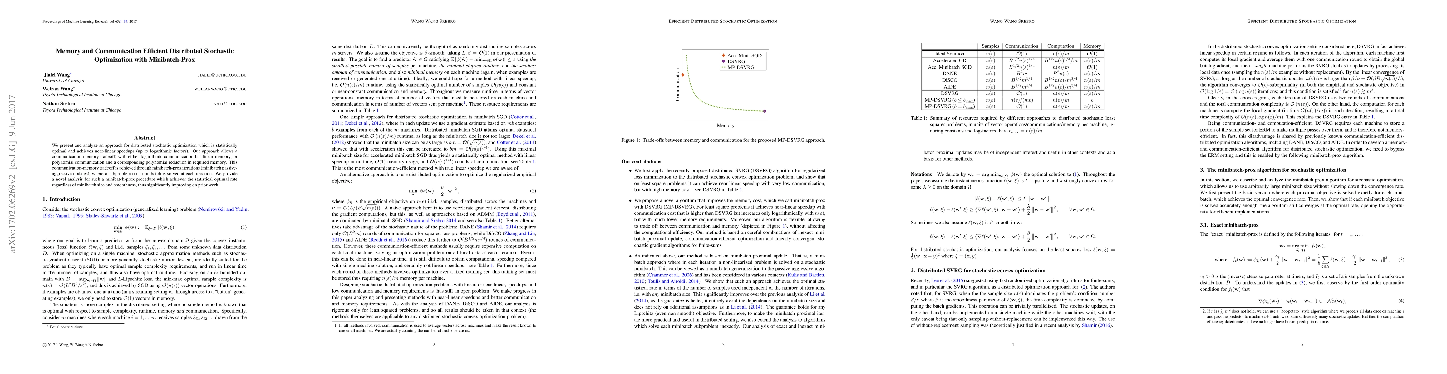 We present and analyze an approach for distributed stochastic optimization which is statistically optimal and achieves near-linear speedups (up to logarithmic factors). Our approach allows a communication-memory tradeoff, with either logarithmic communication but linear memory, or polynomial communication and a corresponding polynomial reduction in required memory. This communication-memory tradeoff is achieved through minibatch-prox iterations (minibatch passive-aggressive updates), where a subproblem on a minibatch is solved at each iteration. We provide a novel analysis for such a minibatch-prox procedure which achieves the statistical optimal rate regardless of minibatch size and smoothness, thus significantly improving on prior work.
