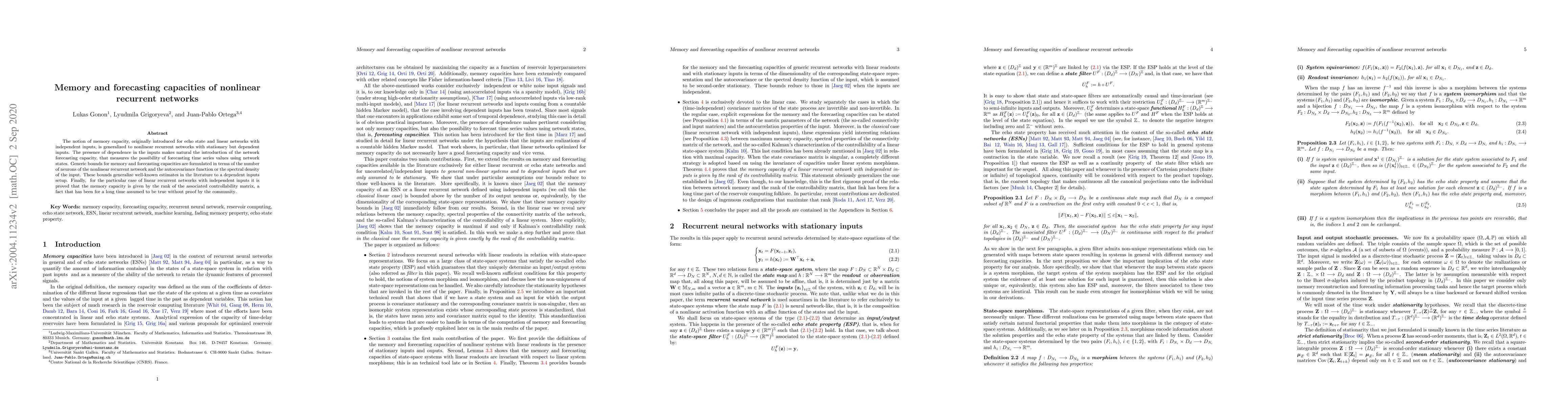 This paper generalizes memory capacity and forecasting capacity to nonlinear recurrent networks with dependent inputs, providing bounds in terms of network neurons and input characteristics.