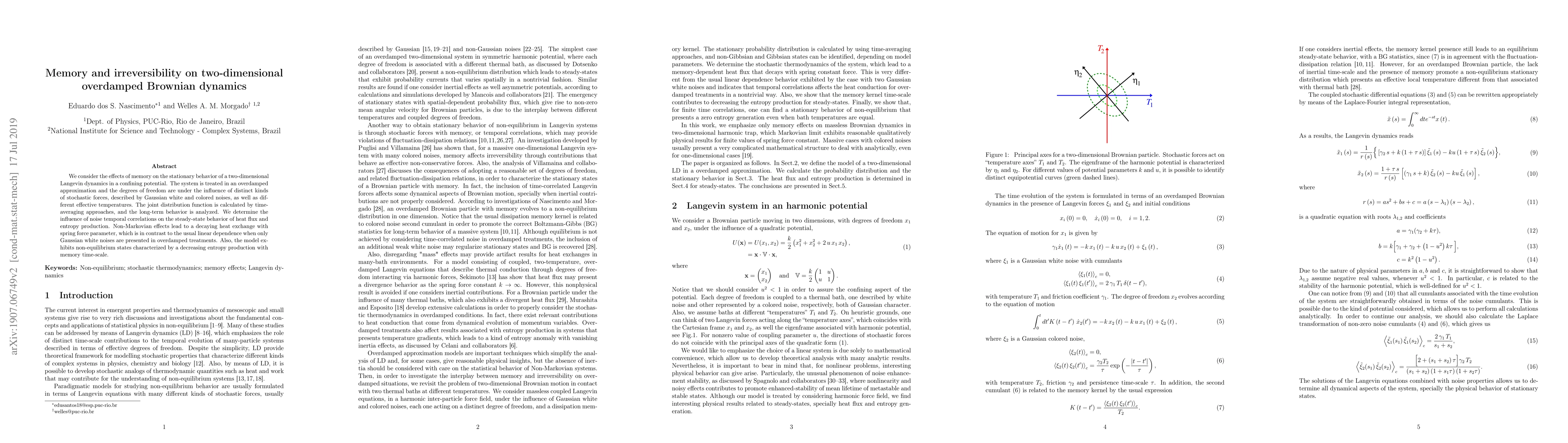 This research explores how memory affects the behavior of a two-dimensional system with Gaussian white and colored noises in an overdamped Brownian dynamics model, leading to non-linear heat exchange and decreasing entropy production over time.
