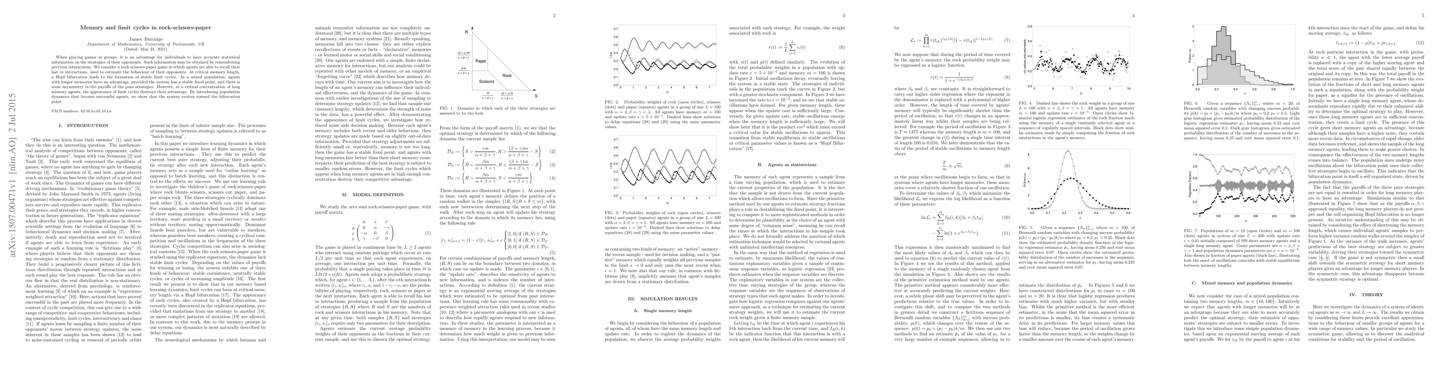 When playing games in groups, it is an advantage for individuals to have accurate statistical information on the strategies of their opponents. Such information may be obtained by remembering previous interactions. We consider a rock-scissors-paper game in which agents are able to recall their last $m$ interactions, used to estimate the behaviour of their opponents. At critical memory length, a Hopf bifurcation leads to the formation of stable limit cycles. In a mixed population, agents with longer memories have an advantage, provided the system has a stable fixed point, and there is some asymmetry in the payoffs of the pure strategies. However, at a critical concentration of long memory agents, the appearance of limit cycles destroys their advantage. By introducing population dynamics that favours successful agents, we show that the system evolves toward the bifurcation point.