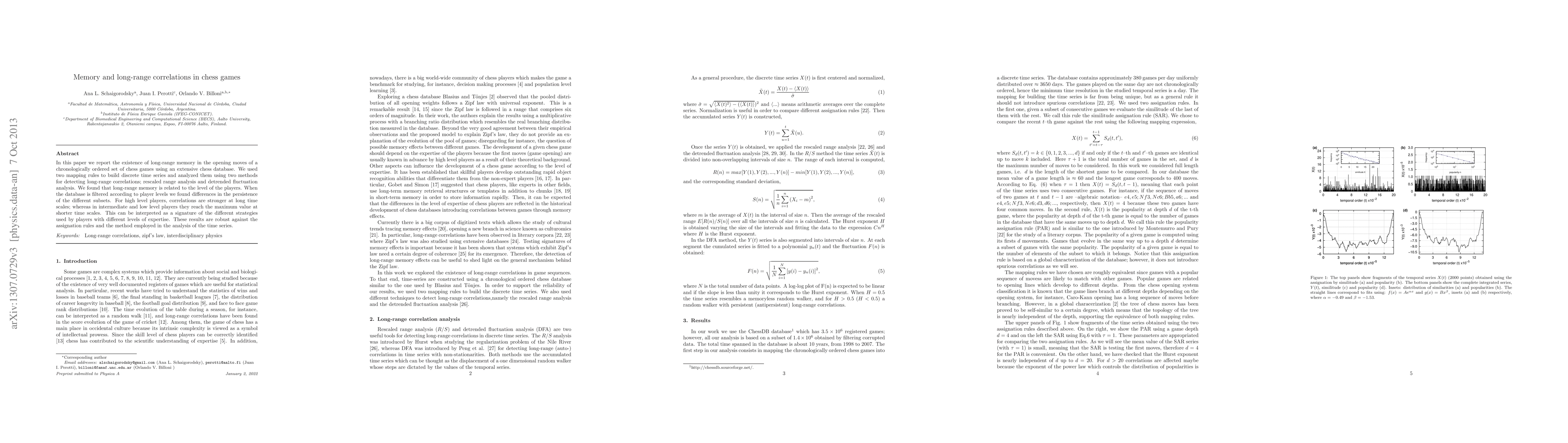 This paper identifies long-range memory in chess opening moves across various player levels using rescaled range and detrended fluctuation analysis. It reveals that high-level players exhibit stronger correlations at longer time scales, suggesting different strategic approaches compared to intermediate and low-level players.
