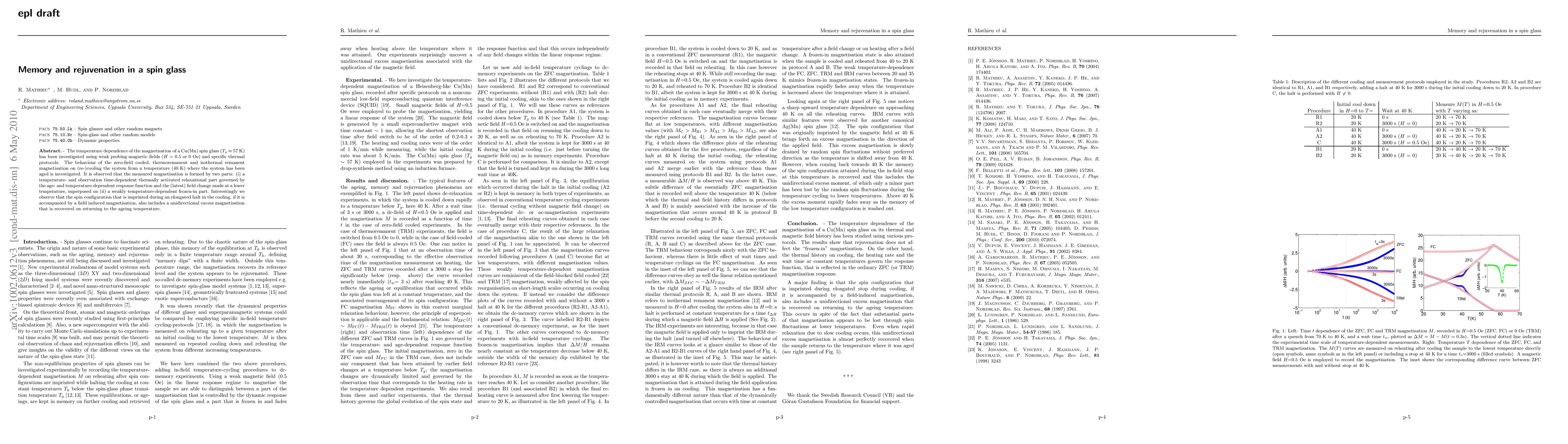 The temperature dependence of the magnetisation of a Cu(Mn) spin glass ($T_g$ $\approx$ 57 K) has been investigated using weak probing magnetic fields ($H$ = 0.5 or 0 Oe) and specific thermal protocols. The behaviour of the zero-field cooled, thermoremanent and isothermal remanent magnetisation on (re-)cooling the system from a temperature (40 K) where the system has been aged is investigated. It is observed that the measured magnetisation is formed by two parts: (i) a temperature- and observation time-dependent thermally activated relaxational part governed by the age- and temperature-dependent response function and the (latest) field change made at a lower temperature, superposed on (ii) a weakly temperature-dependent frozen-in part. Interestingly we observe that the spin configuration that is imprinted during an elongated halt in the cooling, if it is accompanied by a field induced magnetisation, also includes a unidirectional excess magnetisation that is recovered on returning to the ageing temperature.