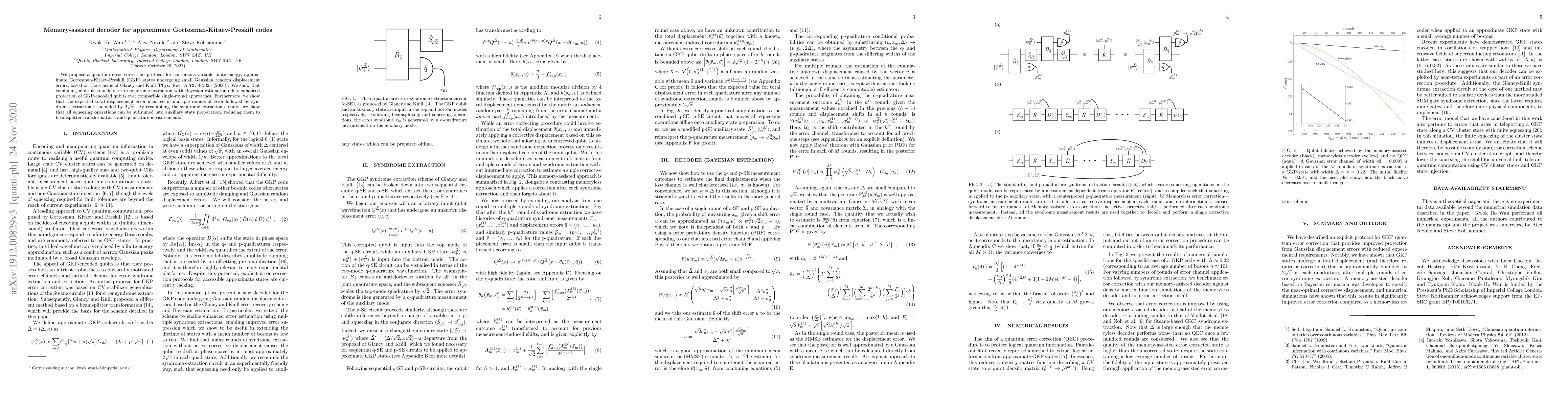 This paper proposes a memory-assisted decoder for correcting small Gaussian errors in approximate Gottesman-Kitaev-Preskill (GKP) quantum states using a multi-round error-syndrome extraction and Bayesian estimation approach, achieving better error protection than single-round methods. The total displacement error is bounded, and squeezing operations are recompiled into simpler beamsplitter transformations.