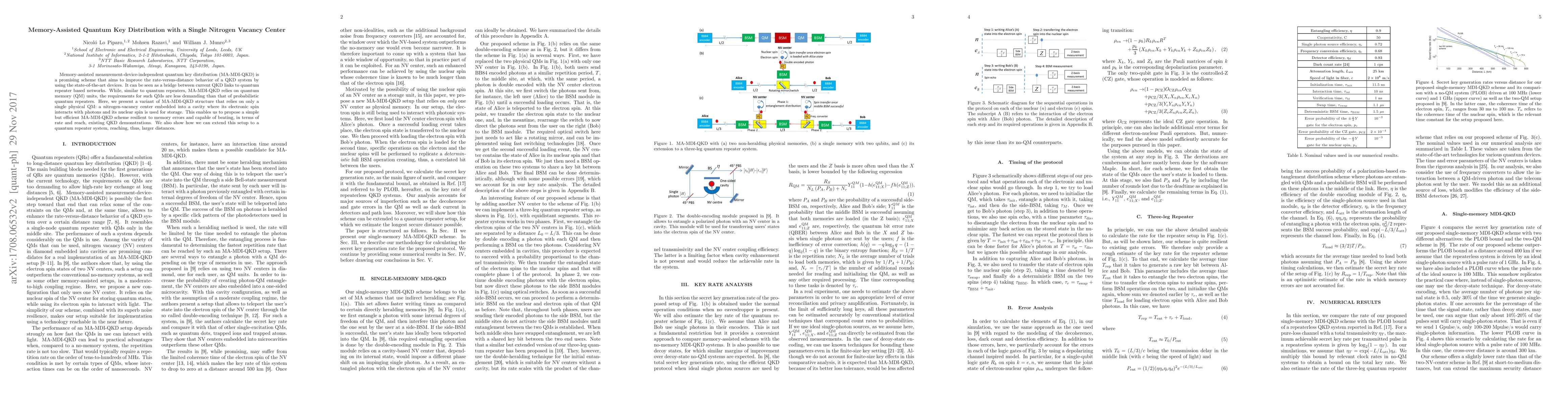 This paper proposes a memory-assisted quantum key distribution (MA-MDI-QKD) scheme utilizing a single nitrogen-vacancy center in a cavity for quantum memory, achieving better rate and distance compared to existing QKD systems and extending to quantum repeater networks.